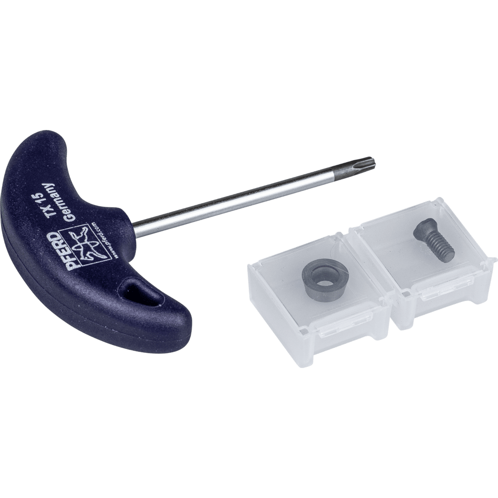 So sadovými súpravami od PFERD TOOLS je možné nahradiť najbežnejšie diely v prípade straty alebo poškodenia. PFERD TOOLS ponúka súpravu na opravu pre hrotové píly a servisné súpravy pre ALUMASTER High Speed Disc a High Speed Torus Cutter. Na výmenu jednotlivých rezacích vložiek na High Speed Torus Cutter. Súprava obsahuje jednu rezaciu vložku, jeden skrutku a šesťhranný kľúč TX 15.