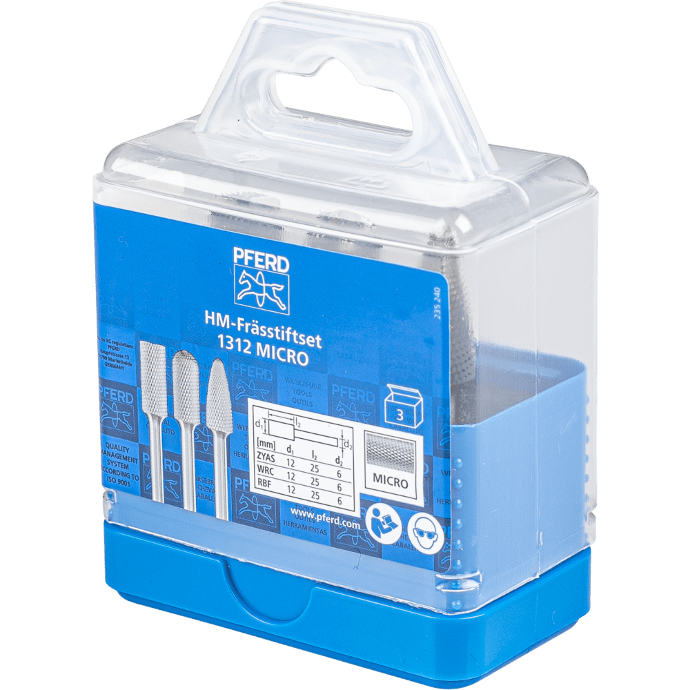 Karbidové frézy s mikro rezom sú špeciálne navrhnuté na jemné odstraňovanie materiálu a používajú sa v oblastiach, kde sa používajú montované/brúsené body, napríklad. Ponúkajú vyššiu rýchlosť odstraňovania materiálu ako montované/brúsené body a ohromujú svojou vysokou kvalitou povrchu. Pracujú tiež s nízkymi vibráciami a malým hlukom. Udržujú svoju geometriu počas celej životnosti nástroja a sú vhodné na manuálne aj strojové aplikácie. Takmer všetky materiály s tvrdosťou až 68 HRC môžu byť obrábané. Sada 1312 MICRO obsahuje tri karbidové frézy na dokončovacie práce v najbežnejších tvaroch a rozmeroch. Pevná plastová krabička chráni nástroje pred znečistením a poškodením.