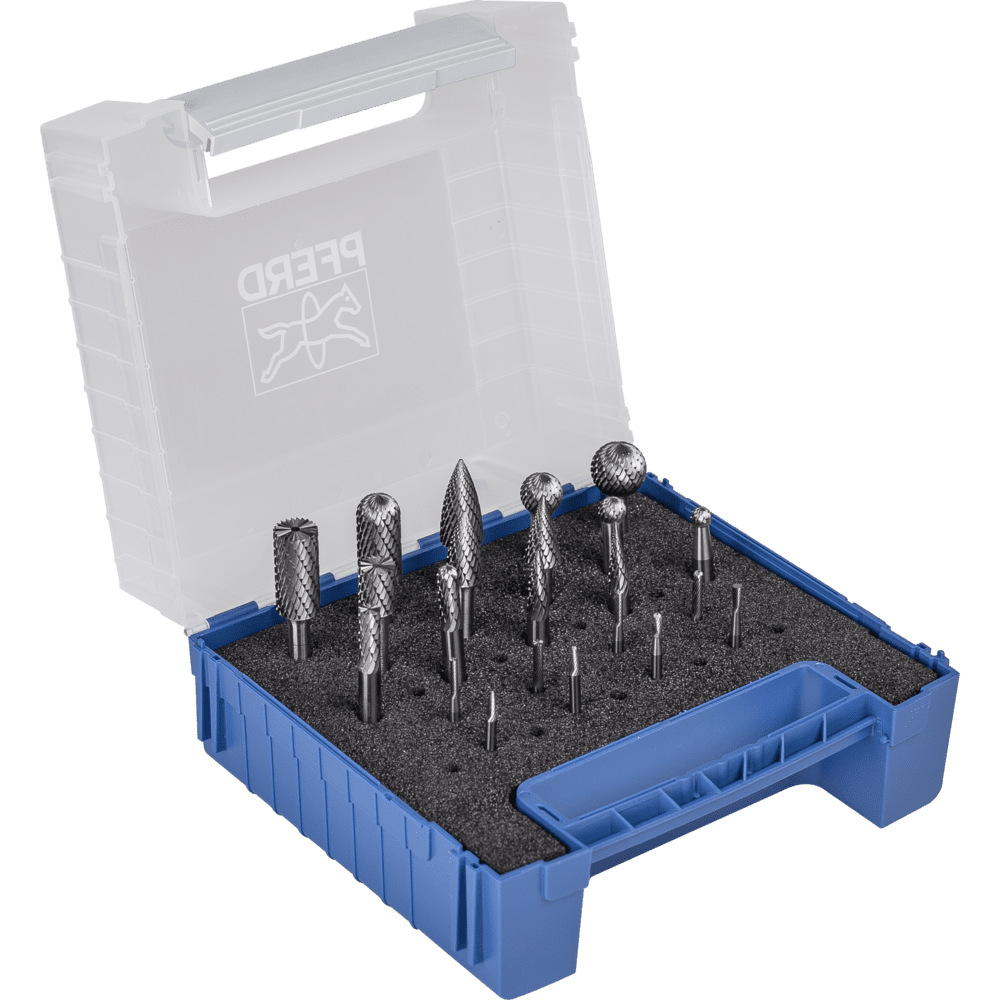 Sada 1500 – rezy 3 PLUS a 5 – obsahuje 22 karbidových burín v najbežnejších tvaroch a rozmeroch pre všeobecné aplikácie. Pevná plastová krabica chráni náradie pred nečistotami a poškodením.
