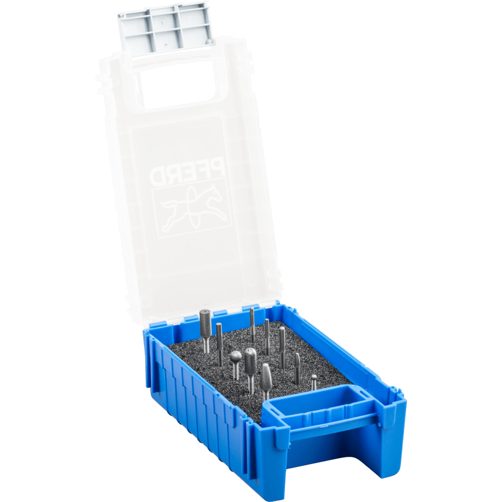 Karbidové frézy s mikro rezom sú špeciálne navrhnuté na jemné odstraňovanie materiálu a používajú sa v oblastiach, kde sa používajú montované/brúsené body, napríklad. Ponúkajú vyššiu rýchlosť odstraňovania materiálu ako montované/brúsené body a ohromujú svojou vysokou kvalitou povrchu. Pracujú tiež s nízkymi vibráciami a malým hlukom. Udržujú svoju geometriu počas celej životnosti nástroja a sú vhodné na manuálne aj strojové aplikácie. Takmer všetky materiály s tvrdosťou až 68 HRC môžu byť obrábané. Sada 1502 MICRO obsahuje desať malých karbidových fréz na dokončovacie práce v najbežnejších tvaroch a rozmeroch. Pevná plastová krabička chráni nástroje pred znečistením a poškodením.