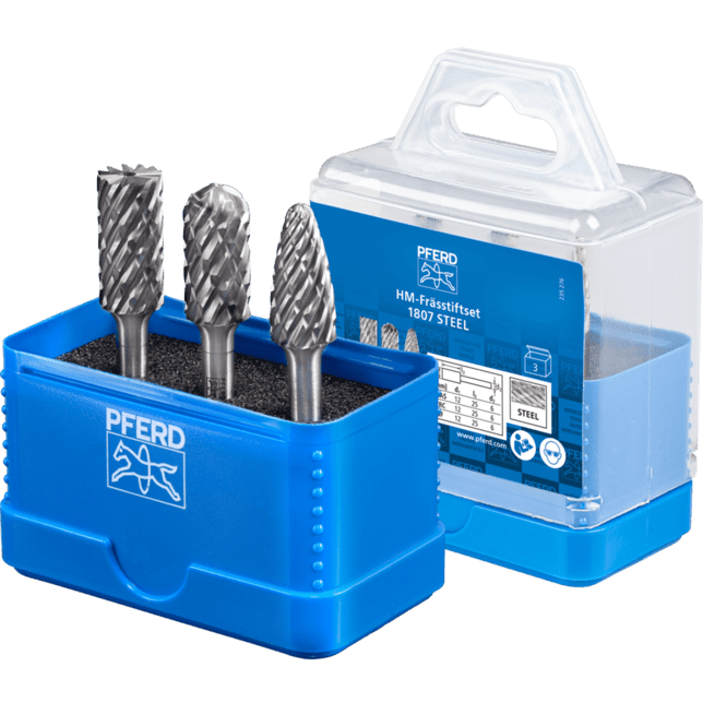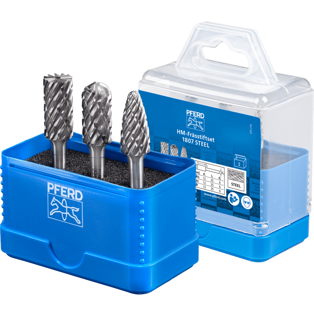 Sada 1807 STEEL obsahuje tri karbidové frézy na spracovanie ocele a liatej ocele v najbežnejších tvaroch a rozmeroch. Pevná plastová krabička chráni náradie pred nečistotami a poškodením.
