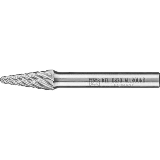 S inovatívnym rezom ALLROUND vyvinula spoločnosť PFERD TOOLS jedinečné frézy na široké použitie na kľúčových materiáloch, ako sú oceľ a liatina, nerezová oceľ (INOX), neželezné kovy a liatina. Rez ALLROUND ponúka všetky výhody osvedčeného rezu 3 PLUS, ale jeho rýchlosť odstraňovania materiálu je až o 30 % vyššia pre oceľ. Umožňuje pohodlnú prácu s nižšími vibráciami a menším hlukom. Rez ALLROUND tiež pomáha používateľom ušetriť značný čas pri práci, čím sa stáva ekonomicky efektívnou voľbou. Kužeľová fréza s okrúhlym koncom podľa DIN 8032.