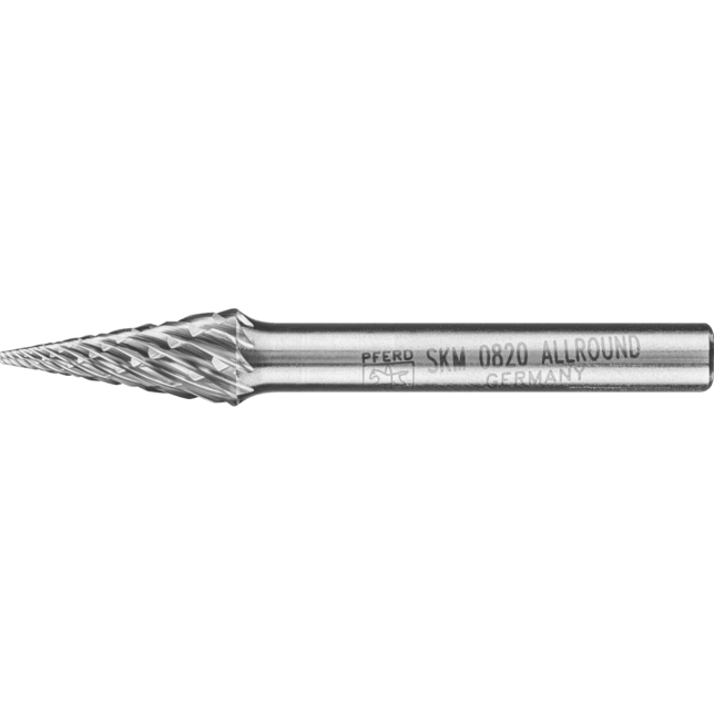 S inovatívnym rezom ALLROUND vyvinula spoločnosť PFERD TOOLS jedinečné frézy na všestranné použitie na kľúčových materiáloch, ako sú oceľ a liatina, nerezová oceľ (INOX), neželezné kovy a liatina. Rez ALLROUND ponúka všetky výhody osvedčeného rezu 3 PLUS, ale jeho rýchlosť odstraňovania materiálu je až o 30 % vyššia pre oceľ. Umožňuje pohodlnú prácu s nižšími vibráciami a menším hlukom. Rez ALLROUND tiež pomáha používateľom ušetriť značný čas pri práci, čím sa stáva ekonomicky efektívnou voľbou. Kužeľová hrotová fréza podľa DIN 8032, zploštený hrot.