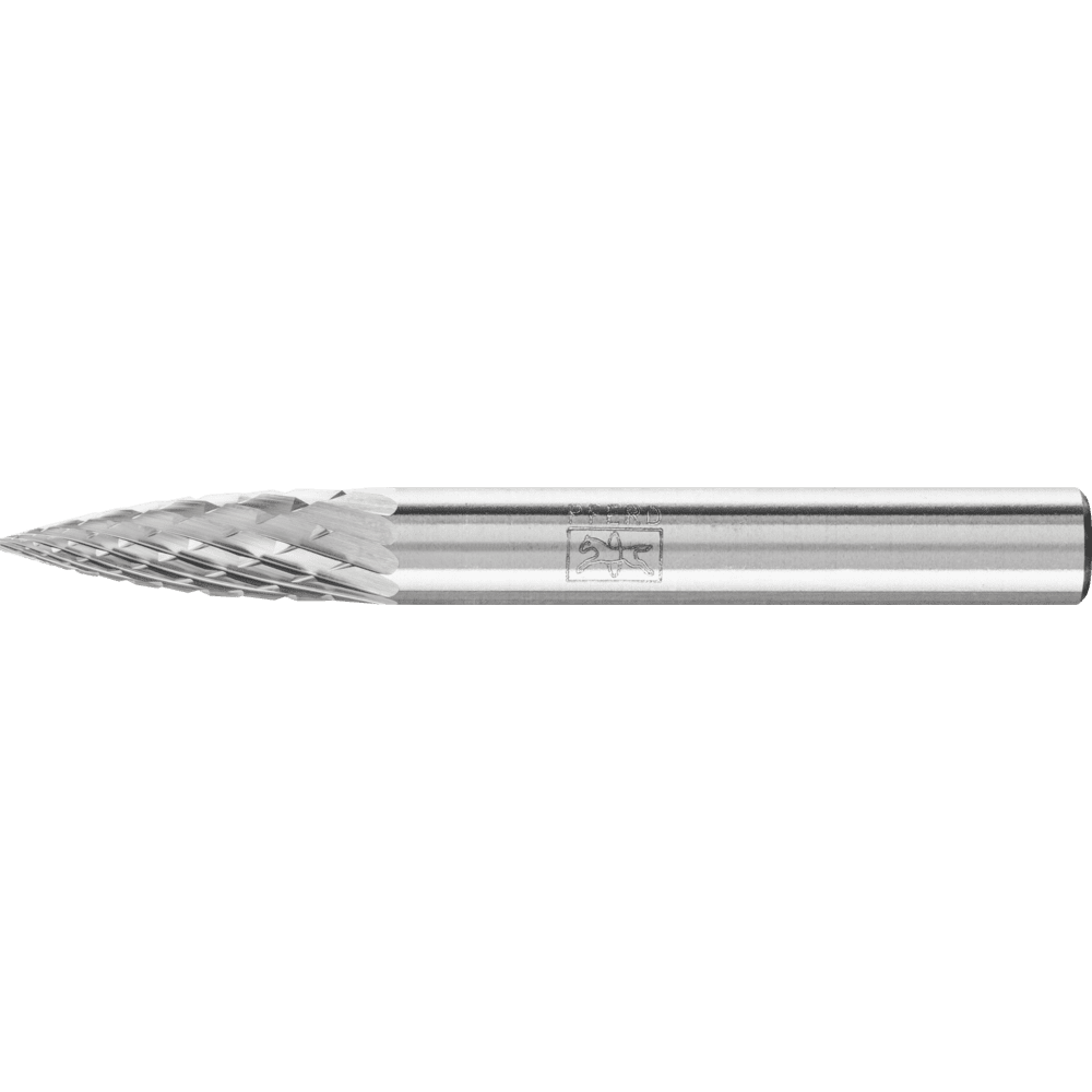 Rez 4 je obzvlášť vhodný na obrábanie nehrdzavejúcej ocele (INOX), ocele a materiálov odolných voči vysokým teplotám, ako sú zliatiny na báze niklu a kobaltu. Vyznačuje sa vysokou rýchlosťou odstraňovania materiálu s krátkymi trieskami a dosahuje dobrý povrch. Karbidové frézy pre všeobecné aplikácie sú vhodné na jemné a hrubé odstraňovanie materiálu na kľúčových materiáloch používaných v priemyselnej výrobe. Poskytujú dobrú rýchlosť odstraňovania materiálu a nie sú špecifické pre konkrétny materiál. Špicatá stromová fréza podľa DIN 8032 s rezom zodpovedajúcim DIN 8033, zploštený hrot.