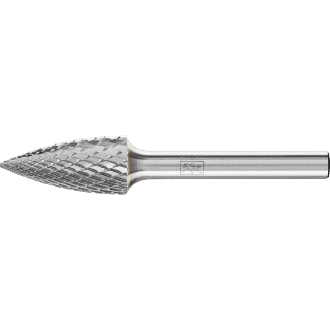 Rez 4 je obzvlášť vhodný na obrábanie nehrdzavejúcej ocele (INOX), ocele a materiálov odolných voči vysokým teplotám, ako sú zliatiny na báze niklu a kobaltu. Vyznačuje sa vysokou rýchlosťou odoberania materiálu s krátkymi trieskami a dosahuje dobrý povrch. Karbidové brúsky na všeobecné aplikácie sú vhodné na jemné a hrubé odoberanie materiálu na kľúčových materiáloch používaných v priemyselnej výrobe. Poskytujú dobrú rýchlosť odoberania materiálu a nie sú špecifické pre konkrétny materiál. Špicatá stromová brúska podľa DIN 8032 s rezom zodpovedajúcim DIN 8033, zploštený hrot.
