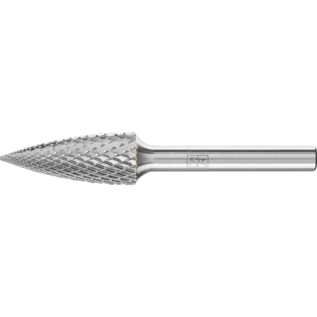 Rez 4 je obzvlášť vhodný na obrábanie nehrdzavejúcej ocele (INOX), ocele a materiálov odolných voči vysokým teplotám, ako sú zliatiny na báze niklu a kobaltu. Vyznačuje sa vysokou rýchlosťou odstraňovania materiálu s krátkymi trieskami a dosahuje dobrý povrch. Karbidové brúsky pre všeobecné aplikácie sú vhodné na jemné a hrubé odstraňovanie materiálu na kľúčových materiáloch používaných v priemyselnej výrobe. Poskytujú dobrú rýchlosť odstraňovania materiálu a nie sú špecifické pre konkrétny materiál. Špicatá stromová brúska podľa DIN 8032 s rezom zodpovedajúcim DIN 8033, zploštený hrot.