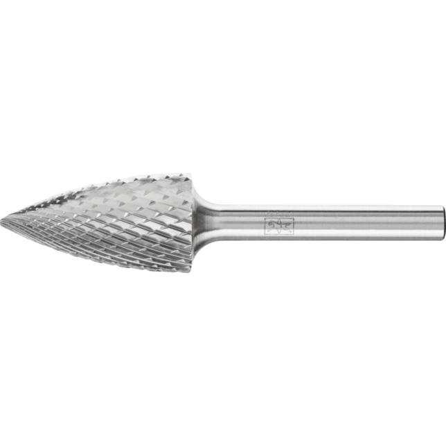 Rez 4 je obzvlášť vhodný na obrábanie nehrdzavejúcej ocele (INOX), ocele a materiálov odolných voči vysokým teplotám, ako sú zliatiny na báze niklu a kobaltu. Vyznačuje sa vysokou rýchlosťou odoberania materiálu s krátkymi trieskami a dosahuje dobrý povrch. Karbidové frézy pre všeobecné aplikácie sú vhodné na jemné a hrubé odoberanie materiálu na kľúčových materiáloch používaných v priemyselnej výrobe. Poskytujú dobrú rýchlosť odoberania materiálu a nie sú špecifické pre konkrétny materiál. Špicatá stromová fréza podľa DIN 8032 s rezom zodpovedajúcim DIN 8033, zploštený hrot.