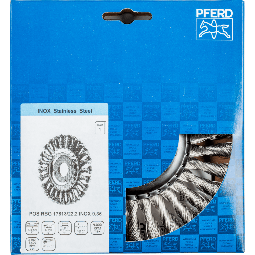 Aby sa splnili špecifické požiadavky na prácu s nerezovou oceľou (INOX), PFERD TOOLS používa drôtovú kvalitu 1.4310 (V2A) pre všetky INOX kefy. Praktické skúsenosti z priemyslu ukázali, že to ponúka veľmi dobrú odolnosť voči korózii s optimálnou životnosťou nástroja. Všetky kefy PFERD TOOLS s INOX vláknami sú farebne označené modrou farbou a sú vhodné na použitie na všetkých nerezových oceľach (INOX), ako je V4A. Drôtová kvalita 1.4310 má tendenciu stať sa feromagnetickou v prípade studenej práce; t.j. môže byť priťahovaná magnetmi. Dôvodom je zmena mikroštruktúry spôsobená deformáciou (napr. počas procesu ťahania drôtu). To nemá žiadny vplyv na kvalitu a odolnosť voči korózii INOX vlákna. Vlákno je stále odolné voči korózii. Nerezový drôt (INOX) odoláva teplotám až do 450 °C. Agresívne kefovanie. Vhodné na ťažké kefovanie v kovovýrobe, ako je odstraňovanie vodného kameňa, hrdze, deburringu, čistenie zvarových švov a odstraňovanie zvyškov lepidla a striekancov.