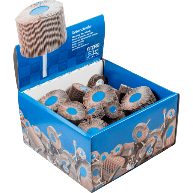 PFERD TOOLS ponúka široký výber abrazívnych nástrojov s povrchovou úpravou na prácu s rôznymi geometriami a materiálmi obrobkov. Tieto nástroje sa skladajú z podkladu, spojiva podkladu a spojiva povlaku, na ktorý sa prichytáva abrazívne zrnko. V závislosti od veľkosti zrna môžu abrazívne nástroje dosiahnuť vysokú rýchlosť odstraňovania materiálu alebo veľmi jemný povrchový finiš. Dostupné podkladové materiály sa líšia vlastnosťami, ako sú pevnosť v ťahu, flexibilita a opotrebenie. S vhodným podkladom je brúsiaci nástroj prispôsobený požiadavkám zamýšľanej aplikácie: papier sa používa v drevárskom priemysle a v obchode, napr. medzi stolármi, maliarmi a dekoratérmi, tkanina sa prevažne používa na prácu s kovmi a vulkanizovaná vlákna sú veľmi odolné voči opotrebeniu a používajú sa v rôznych hrúbkach prevažne na výrobu vláknitých diskov. Sada pozostávajúca z 40 rôznych montovaných flap koliesok v prevedení z oxidu hliníka A s priemerom stopky 6 mm. Na montovaných flap kolieskach sú klapky vyrobené z abrazívneho povlaku usporiadané radiálne okolo osi nástroja v štruktúre pripomínajúcej ventilátor. Ich flexibilita im umožňuje dokonale sa prispôsobiť kontúram obrobku. Abrazívne zrnko je zakotvené v robustnom, flexibilnom podkladovom materiáli pomocou resinoidného spojiva.
