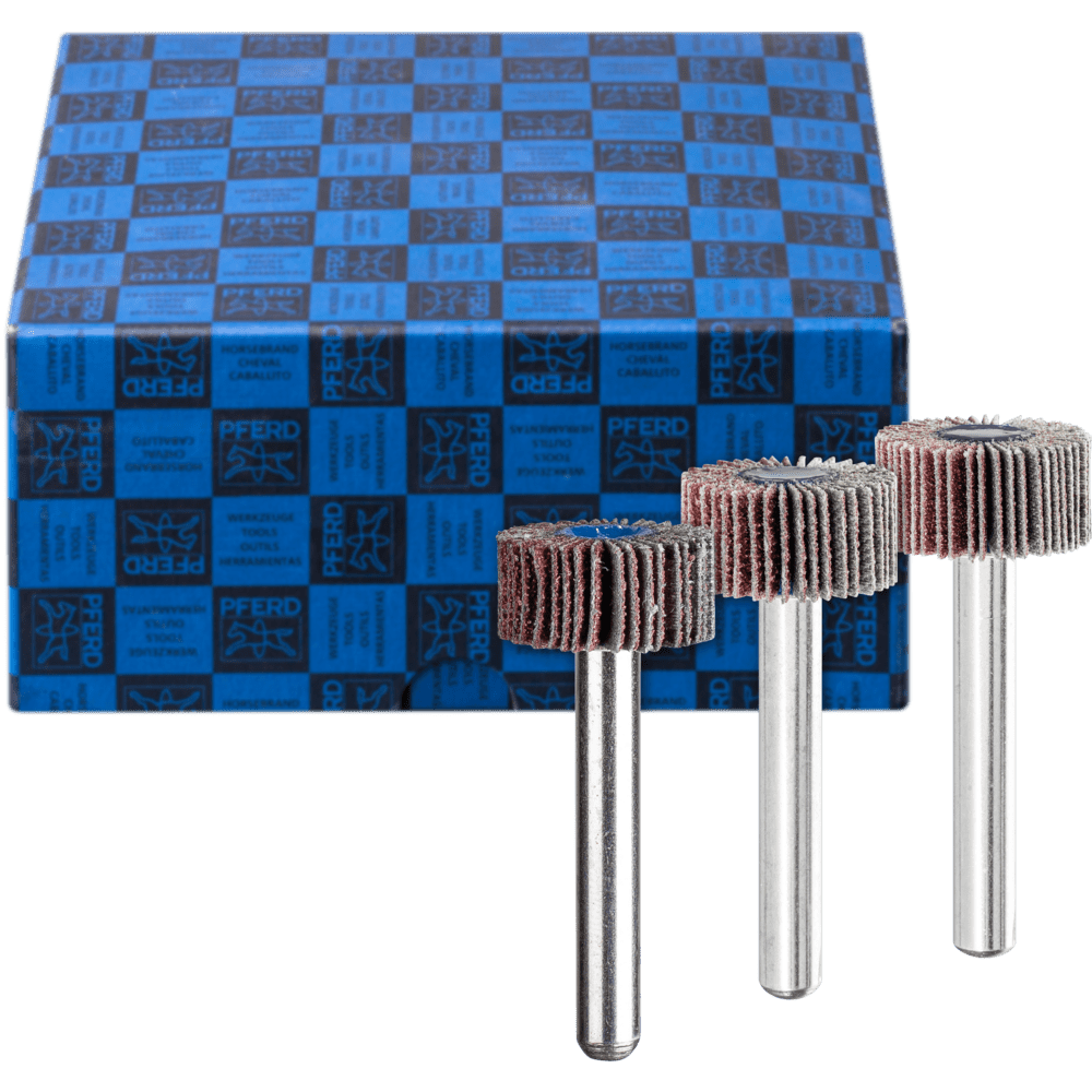PFERD TOOLS ponúka široký výber abrazívnych nástrojov s povrchovou úpravou na prácu s rôznymi geometriami obrobkov a materiálmi. Tieto nástroje sa skladajú z podkladu, spojiva podkladu a spojiva na povrchovú úpravu, aby sa abrazívne zrno mohlo prichytiť. V závislosti od veľkosti zrna môžu abrazívne nástroje s povrchovou úpravou dosiahnuť vysokú rýchlosť odstraňovania materiálu alebo veľmi jemný povrchový finiš. Dostupné podkladové materiály sa líšia vlastnosťami, ako sú pevnosť v ťahu, flexibilita a opotrebovateľnosť. S vhodným podkladom je brúsiaci nástroj prispôsobený požiadavkám zamýšľanej aplikácie: papier sa používa v drevárskom priemysle a v obchode, napr. medzi stolármi, maliarmi a dekoratérmi, tkanina sa prevažne používa na prácu s kovmi a vulkanizovaná vlákna sú veľmi odolné voči opotrebeniu a používajú sa v rôznych hrúbkach prevažne na výrobu vláknitých diskov. Sada obsahuje tri montované lamelové kolesá z oxidu hliníka typu A s priemerom stopky 6 mm v hrúbkach 60, 80 a 120. Na montovaných lamelových kolesách sú lamely z abrazívneho materiálu usporiadané radiálne okolo osi nástroja v štruktúre pripomínajúcej ventilátor. Ich flexibilita im umožňuje dokonale sa prispôsobiť kontúram obrobku. Abrazívne zrno je zakotvené v pevných, flexibilných tkaninových podkladových materiáloch pomocou resinoidného spojiva.
