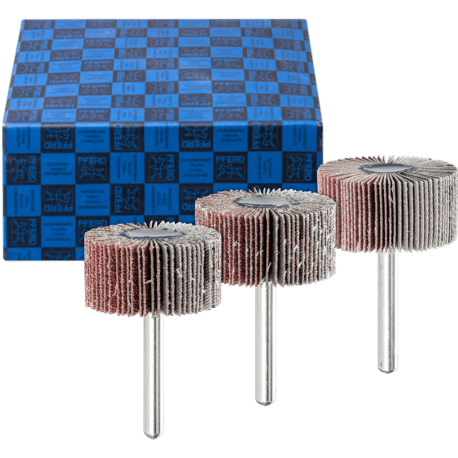 PFERD TOOLS ponúka široký výber abrazívnych nástrojov s povrchovou úpravou na prácu s rôznymi geometriami a materiálmi obrobkov. Tieto nástroje sa skladajú z podkladu, spojiva podkladu a spojiva povlaku, na ktorý sa prichytáva abrazívny zrn. V závislosti od veľkosti zrna môžu abrazívne nástroje s povrchovou úpravou dosiahnuť vysokú rýchlosť odstraňovania materiálu alebo veľmi jemný povrchový finiš. Dostupné podkladové materiály sa líšia vlastnosťami, ako sú pevnosť v ťahu, flexibilita a opotrebovateľnosť. S vhodným podkladom je brúsiaci nástroj prispôsobený požiadavkám zamýšľanej aplikácie: papier sa používa v drevárskom priemysle a v obchode, napr. medzi stolármi, maliarmi a dekoratérmi, tkanina sa prevažne používa na prácu s kovmi a vulkanizovaná vlákna sú veľmi odolné voči opotrebeniu a používajú sa v rôznych hrúbkach prevažne na výrobu vláknitých diskov. Sada obsahuje tri montované lamelové kolesá z oxidu hliníka typu A s priemerom stopky 6 mm v hrubostiach 60, 80 a 120. Na montovaných lamelových kolesách sú lamely z abrazívneho povlaku usporiadané radiálne okolo osi nástroja v štruktúre pripomínajúcej ventilátor. Ich flexibilita im umožňuje dokonale sa prispôsobiť kontúram obrobku. Abrazívne zrnko je zakotvené v robustnom, flexibilnom tkaninovom podklade pomocou resinoidného spojiva.