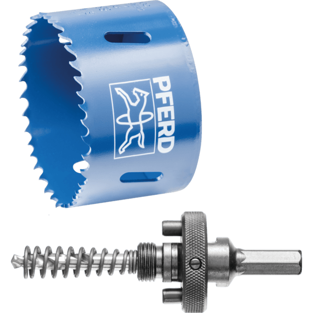 - Korunková píla je pohodlne centrovaná a vedená pomocou vymeniteľného HSS pilotného vrtáka.