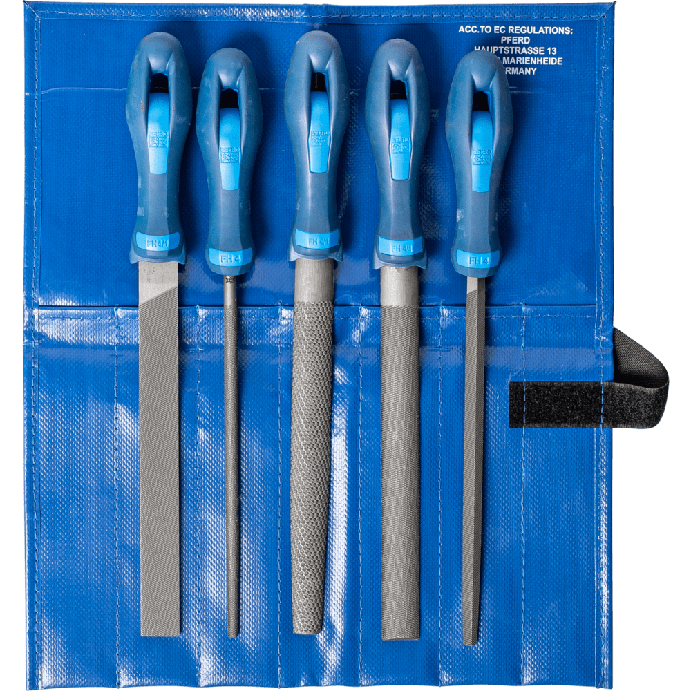 Kvalitné pilníky pre priemysel a obchod v ochrannom a klimaticky odolnom PVC obale na uskladnenie v náradí alebo na pracovnej doske. Každý pilník je vybavený ergonomickou rukoväťou.