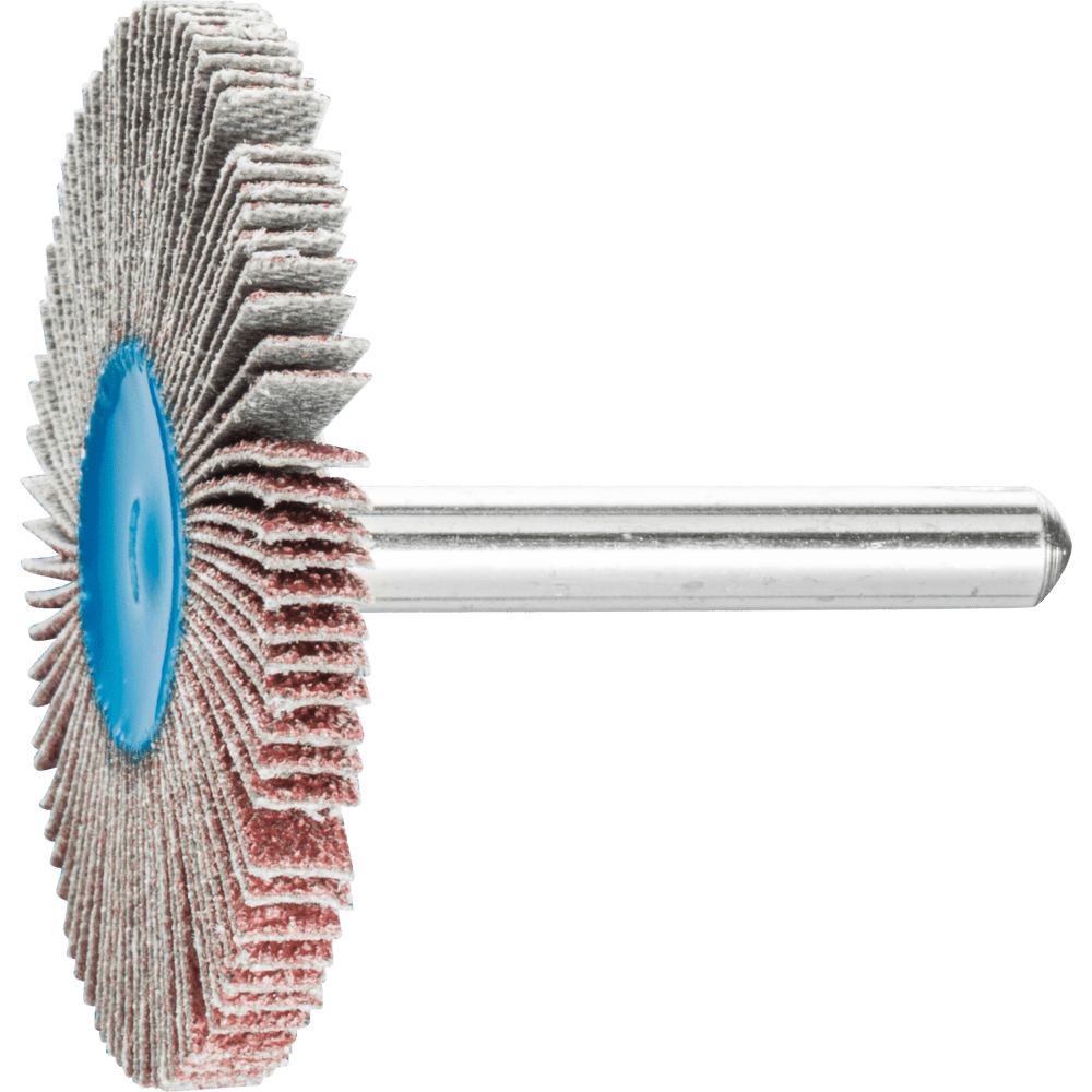 Na montovaných lamelových kolesách sú lamely vyrobené z abrazívneho materiálu usporiadané radiálne okolo osi náradia v štruktúre pripomínajúcej ventilátor. Ich flexibilita im umožňuje dokonale sa prispôsobiť kontúram obrobku. Abrasívne zrnko je zakotvené v robustnom, flexibilnom textilnom podklade pomocou živicovej väzby. V norme ISO 3919 sú montované lamelové kolesá označené ako "lamelové kolesá s hriadeľom". Pre všeobecné aplikácie od hrubého po jemné brúsenie.