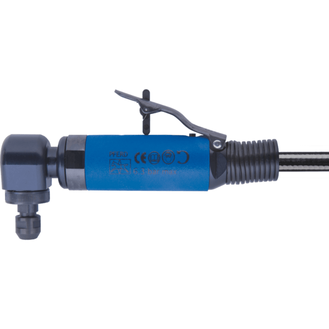Hnací mechanizmus je vybavený upínacím nástrojom pre montované nástroje. Smer výfuku vzduchového brúsky je vzadu. Výkonný pohon má nízku výšku hlavy pod uhlom a je vhodný na jednoruké použitie. Vzduchová brúska sa musí používať s olejom. Vďaka páke ventilu má pohon bezpečnostný spínač. 1 m výfuková hadica a 3 m hadica na prívod vzduchu s 1/4" vonkajším závitom a závitovým rýchlospojkou (STGI), 6 mm upínací nástavec, 2 kľúče.