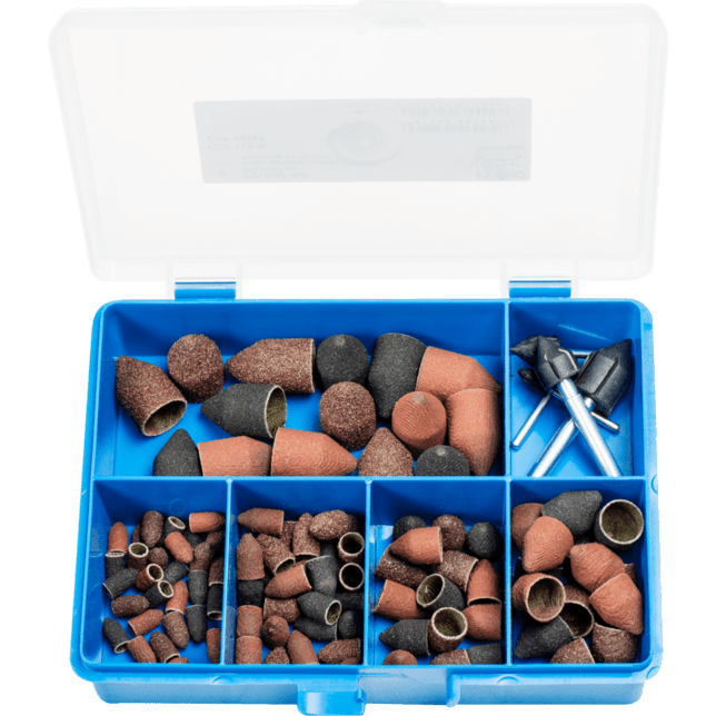 Súprava rôznych abrazívnych čiapok POLICAP s vhodným držiakom. Nástroje POLICAP majú bezšvový dizajn a celá povrchová plocha nástroja môže byť použitá. Farebný kód pre zrnitosti: 60 a 80 = hnedá, 150 = čierna, 280 = červenohnedá. Zúžený kužeľový tvar s polomerovým koncom WKG (predtým tvar G).