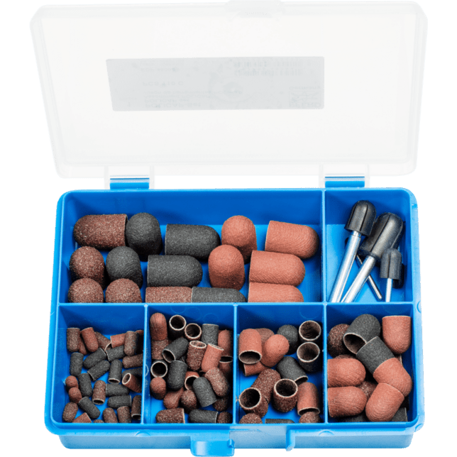 Súprava rôznych abrazívnych čiapok POLICAP s vhodným držiakom. Nástroje POLICAP majú bezšvový dizajn a celá plocha nástroja môže byť použitá. Farebný kód pre zrnitosti: 60 a 80 = hnedá, 150 = čierna, 280 = červenohnedá. Valcový tvar s polomerom na konci WRC (predtým tvar C).