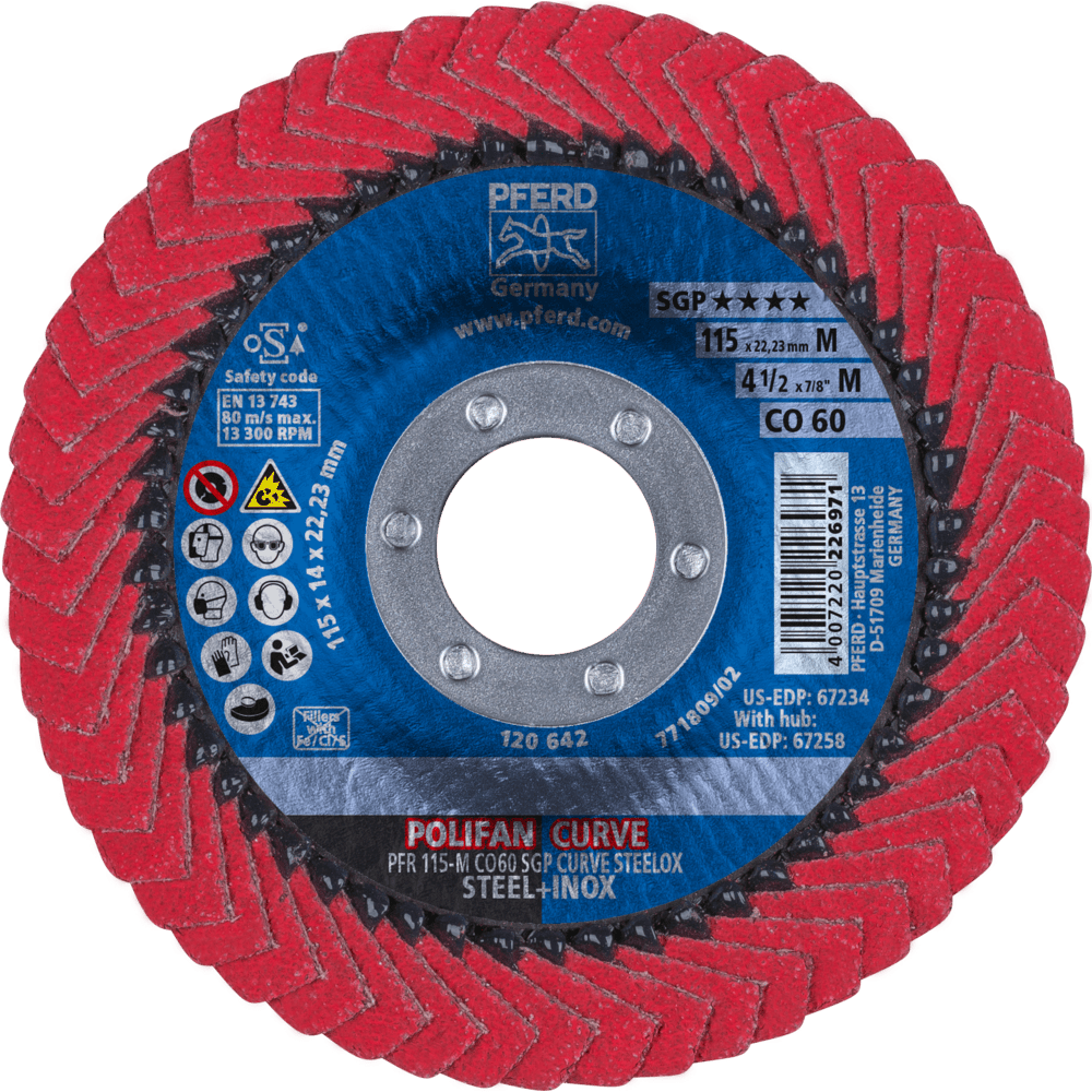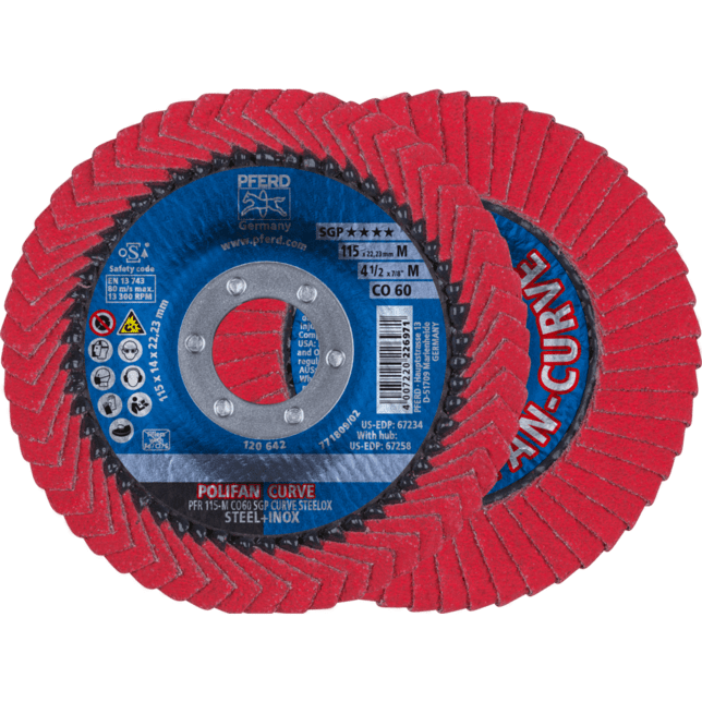 Nástroje špeciálnej línie SGP sú špeciálne vyvinuté pre konkrétne úlohy a ponúkajú používateľovi kľúčové výhody oproti konvenčným produktom. Okrem toho špeciálna línia SGP zahŕňa nástroje, ktoré ponúkajú maximálnu ekonomickú efektívnosť vďaka svojmu mimoriadne vysokému výkonu počas používania. Disk s lamelami POLIFAN-CURVE bol špeciálne vyvinutý na prácu na rohových zvaroch. Je to jediný disk s lamelami na svete, ktorý má lamely na oboch stranách brúsenia a na zadnej strane, ako aj na rádiuse. POLIFAN CURVE od PFERD TOOLS je patentovaný v mnohých krajinách po celom svete. Vysokovýkonný disk s lamelami na dosiahnutie jemných povrchových úprav na oceľi a nerezovej oceľi (INOX).