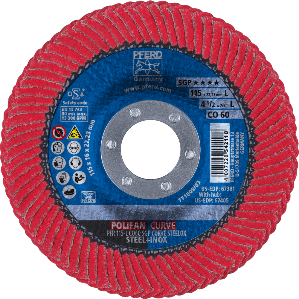 Nástroje špeciálnej línie SGP sú špeciálne vyvinuté pre konkrétne úlohy a ponúkajú používateľovi kľúčové výhody oproti konvenčným produktom. Okrem toho špeciálna línia SGP zahŕňa nástroje, ktoré ponúkajú maximálnu ekonomickú efektívnosť vďaka svojej mimoriadne vysokej výkonnosti počas používania. Disk s lamelami POLIFAN-CURVE bol špeciálne vyvinutý na prácu na rohových zvaroch. Je to jediný disk s lamelami na svete, ktorý má lamely na oboch stranách brúsenia a na zadnej strane, ako aj na rádiuse. POLIFAN CURVE od PFERD TOOLS je patentovaný v mnohých krajinách po celom svete. Vysokovýkonný disk s lamelami na dosiahnutie jemných povrchových úprav na oceľi a nerezovej oceľi (INOX).