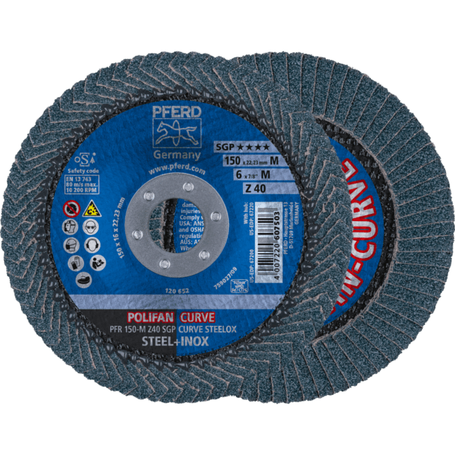 Nástroje špeciálnej línie SGP sú špeciálne vyvinuté pre konkrétne úlohy a ponúkajú používateľovi kľúčové výhody oproti konvenčným produktom. Okrem toho špeciálna línia SGP zahŕňa nástroje, ktoré ponúkajú maximálnu ekonomickú efektívnosť vďaka svojmu mimoriadne vysokému výkonu počas používania. Disk s lamelami POLIFAN-CURVE bol špeciálne vyvinutý na prácu na rohových zvaroch. Je to jediný disk s lamelami na svete, ktorý má lamely na brúsiacej strane, ako aj na zadnej strane a na rádiuse. POLIFAN CURVE od PFERD TOOLS je patentovaný v mnohých krajinách po celom svete. Vysokovýkonný disk s lamelami pre maximálne odstraňovanie materiálu na oceľ a nerezovú oceľ (INOX).