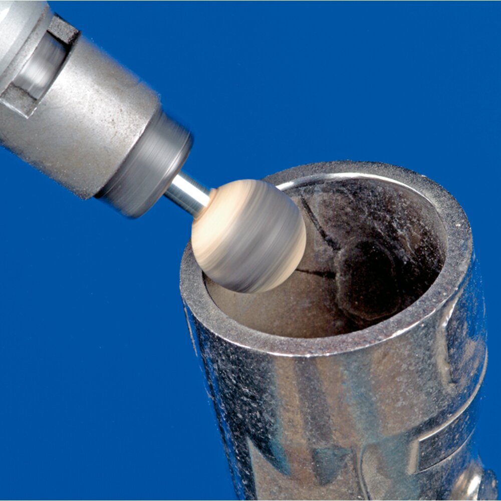 Nástroje na jemné brúsenie Poliflex sú vyrábané s vysokou presnosťou tvaru, výnimočne konzistentnou kvalitou a prísnymi rozmerovými toleranciami. Sú ideálne na jemné brúsenie, štruktúrovanie a prípravy na leštiace práce a veľmi často sa používajú na aplikácie v oblasti výroby nástrojov a foriem. Nástroje na jemné brúsenie Poliflex s LR väzbou sú vyrábané z bieleho oxidu hliníka. LR väzba je tvrdá, robustná väzba. Vhodné na použitie na povrchoch. Namontovaný brúsny kotúč v guľovom tvare na jemné brúsenie vnútorných radií, kontúr a prechodov.