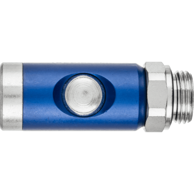 Pripojovacie fitingy pre vzduchové brúsky. Samozatváracie ventilové spojky s vonkajším závitom 1/2" s uvoľňovacím tlačidlom.