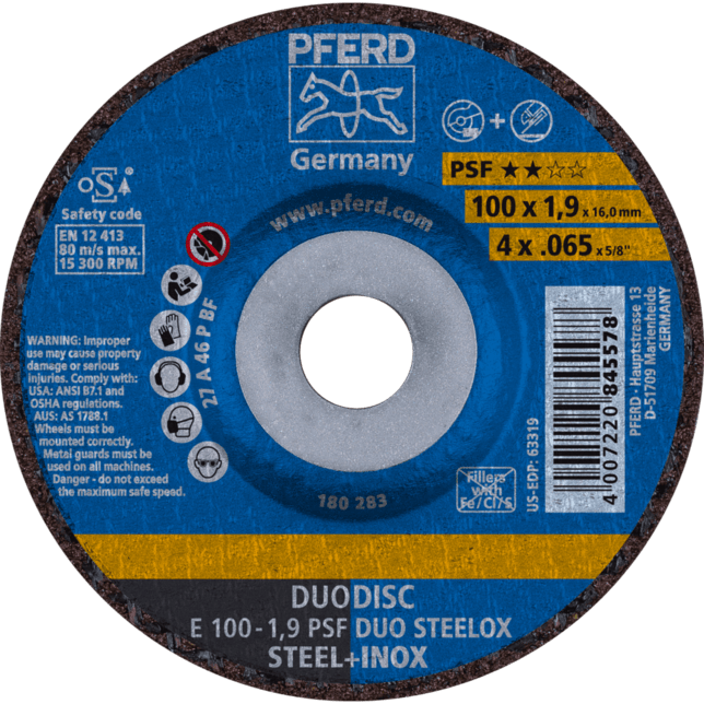 Vstupná rada Universal Line PSF obsahuje robustné nástroje na spracovanie najbežnejších materiálov. Nástroje Universal Line PSF dosahujú dobré výsledky s vysokou ekonomickou efektívnosťou. Kombinovaný kotúč na oceľ a nerezovú oceľ (INOX) s vysokým rezacím výkonom a dobrou životnosťou nástroja. Kombinovaný kotúč DUODISC je riešením pre bezpečné rezanie a brúsenie s len jedným nástrojom. Spĺňa všetky požiadavky normy EN 12413 pre rezacie a brúsne kotúče.