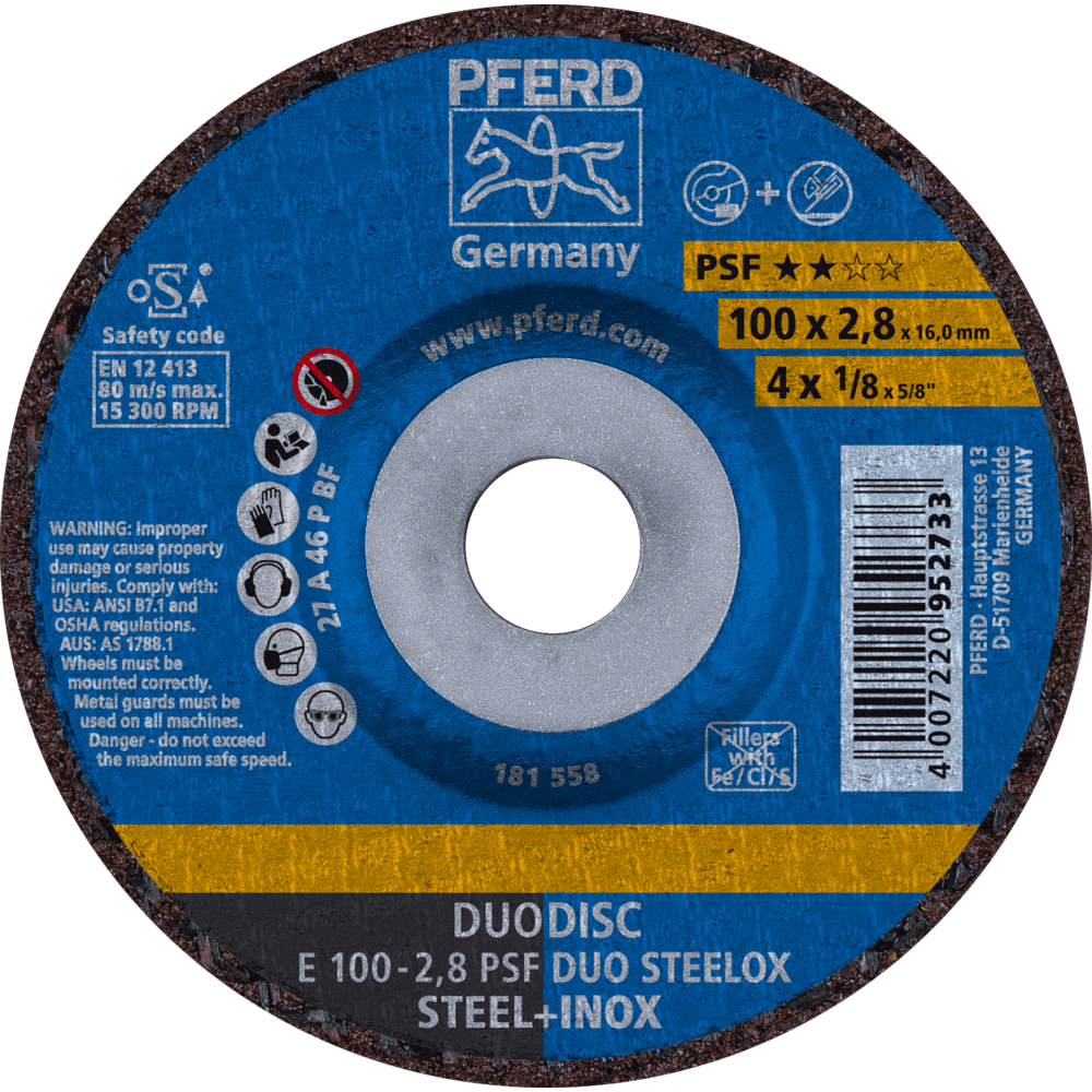 Vstupná rada Universal Line PSF obsahuje robustné náradie na spracovanie najbežnejších materiálov. Náradie Universal Line PSF dosahuje dobré výsledky s vysokou ekonomickou efektívnosťou. Kombinovaný kotúč na oceľ a nerezovú oceľ (INOX) s vysokým rezacím výkonom a dobrou životnosťou náradia. Kombinovaný kotúč DUODISC je riešením pre bezpečné rezanie a brúsenie s len jedným náradím. Spĺňa všetky požiadavky normy EN 12413 pre rezacie a brúsne kotúče.