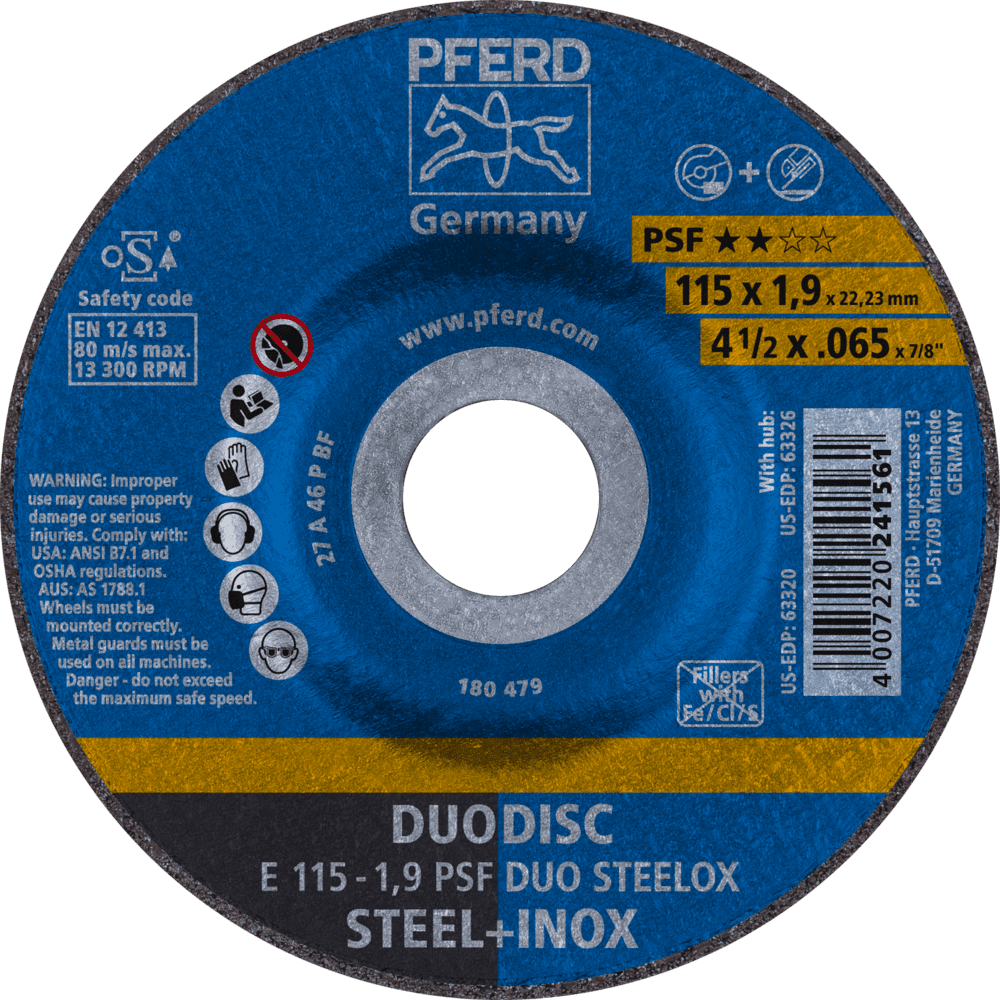 Základná rada Universal Line PSF obsahuje robustné nástroje na spracovanie najbežnejších materiálov. Nástroje Universal Line PSF dosahujú dobré výsledky s vysokou ekonomickou efektívnosťou. Kombinovaný kotúč na oceľ a nerezovú oceľ (INOX) s vysokým rezacím výkonom a dobrou životnosťou nástroja. Kombinovaný kotúč DUODISC je riešením pre bezpečné rezanie a brúsenie s len jedným nástrojom. Spĺňa všetky požiadavky normy EN 12413 pre rezacie a brúsne kotúče.
