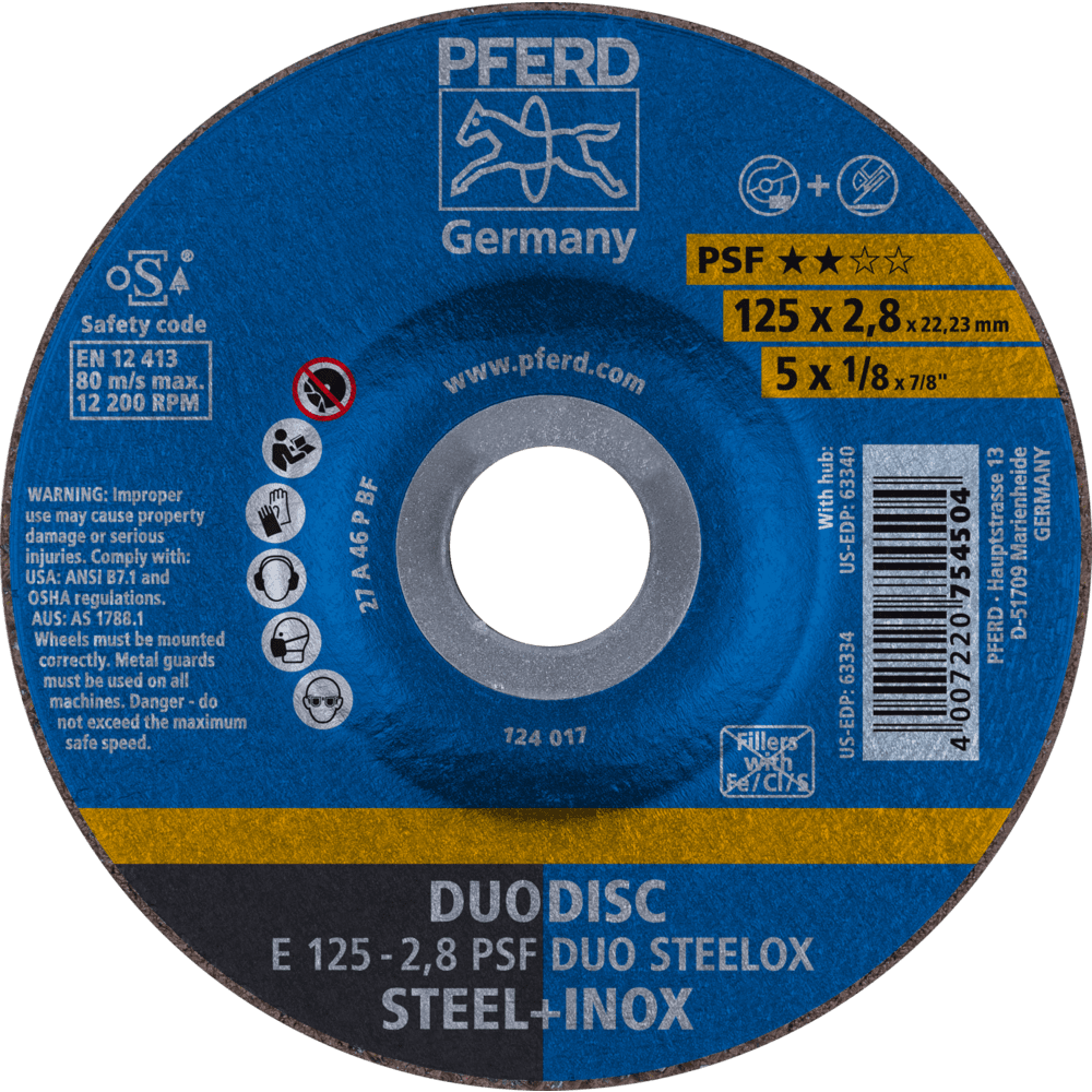 Základná rada Universal Line PSF obsahuje robustné náradie na spracovanie najbežnejších materiálov. Náradie Universal Line PSF dosahuje dobré výsledky s vysokou ekonomickou efektívnosťou. Kombinovaný kotúč na oceľ a nerezovú oceľ (INOX) s vysokým rezacím výkonom a dobrou životnosťou náradia. Kombinovaný kotúč DUODISC je riešením pre bezpečné rezanie a brúsenie s len jedným náradím. Spĺňa všetky požiadavky normy EN 12413 pre rezacie a brúsne kotúče.