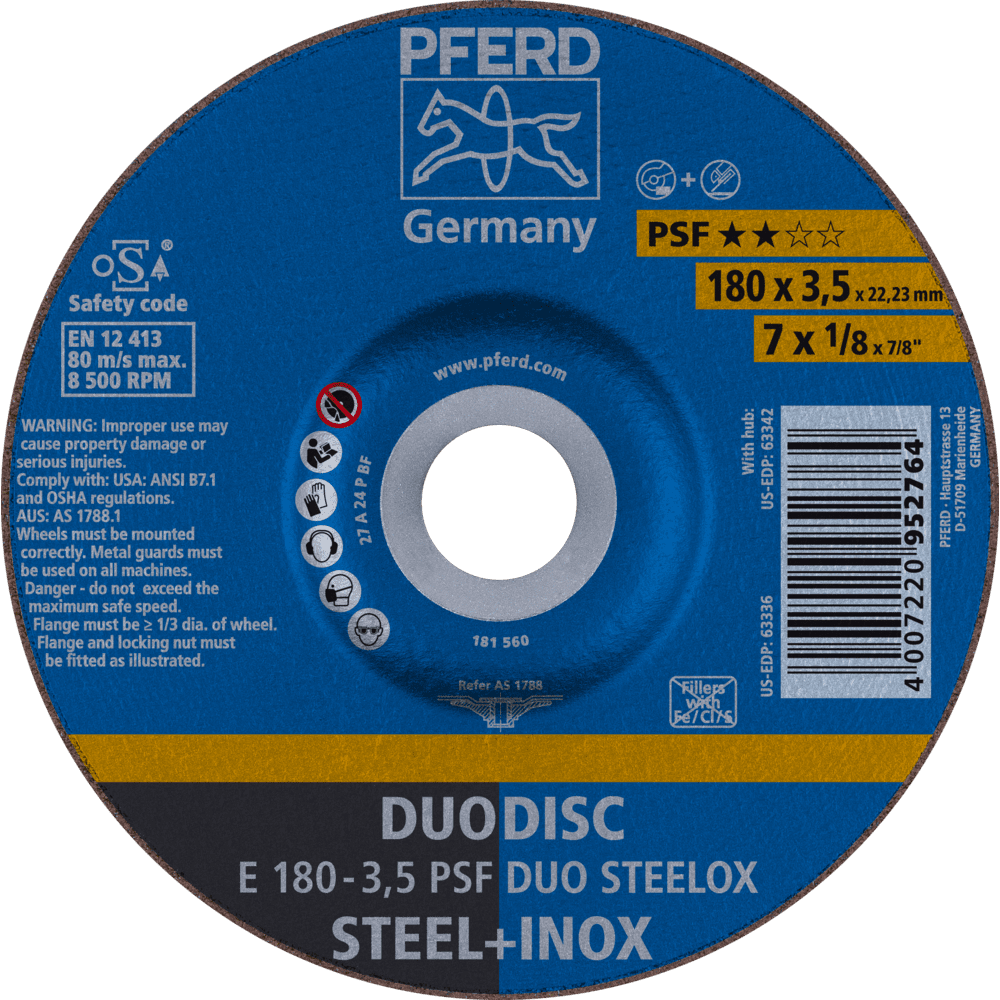 Základná rada Universal Line PSF obsahuje robustné náradie na spracovanie najbežnejších materiálov. Náradie Universal Line PSF dosahuje dobré výsledky s vysokou ekonomickou efektívnosťou. Kombinovaný kotúč na oceľ a nerezovú oceľ (INOX) s vysokým rezacím výkonom a dobrou životnosťou náradia. Kombinovaný kotúč DUODISC je riešením pre bezpečné rezanie a brúsenie s len jedným náradím. Spĺňa všetky požiadavky normy EN 12413 pre rezacie a brúsne kotúče.