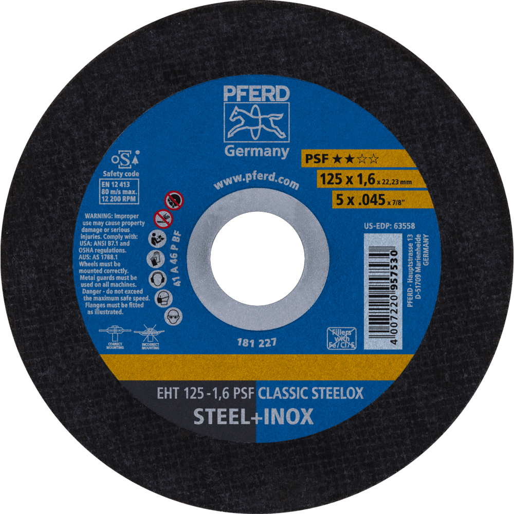 Vstupná rada Universal Line PSF zahŕňa robustné náradie na spracovanie najbežnejších materiálov. Nástroje Universal Line PSF dosahujú dobré výsledky s vysokou ekonomickou efektívnosťou. Rezné kotúče na oceľ a nerezovú oceľ (INOX) s vysokým rezacím výkonom a dobrou životnosťou nástroja. Pracovníci po celom svete dôverujú značke Blue a volia tenké rezné kotúče od PFERD TOOLS. Produktová rada PFERD TOOLS zahŕňa tenké rezné kotúče v rôznych prevedeniach a preto správne riešenie nástroja pre akúkoľvek aplikáciu – ergonomicky optimalizované, efektívne a s najvyššou úrovňou bezpečnosti. Tenké rezné kotúče od PFERD TOOLS sa vyznačujú svojou špeciálnou formuláciou spojiva. Intenzívny výskum a vývoj v kombinácii so systematickou implementáciou v moderných výrobných zariadeniach zaručujú vysoké kvalitatívne a bezpečnostné štandardy PFERD TOOLS.