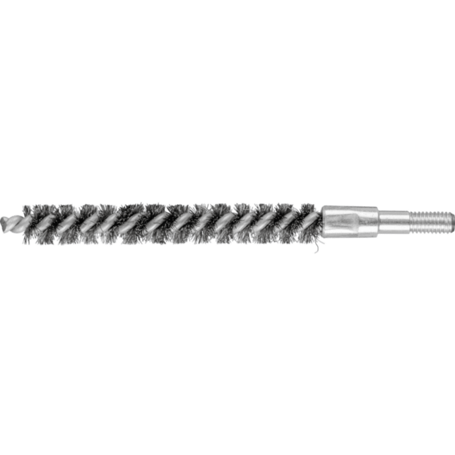 Obzvlášť vhodné na odhrotovanie a čistenie rúr, závitov, spojovacích manžiet a valcov. Aby sa splnili špecifické požiadavky na prácu s nerezovou oceľou (INOX), PFERD TOOLS používa drôtovú kvalitu 1.4310 (V2A) pre všetky INOX kefy. Praktické skúsenosti z priemyslu ukázali, že to ponúka veľmi dobrú odolnosť voči korózii s optimálnou životnosťou nástroja. Všetky kefy PFERD TOOLS s INOX vláknami sú farebne označené modrou farbou a sú vhodné na použitie na všetkých nerezových oceľach (INOX), ako je V4A. Drôtová kvalita 1.4310 má tendenciu stať sa feromagnetickou pri studenom spracovaní; t.j. môže byť priťahovaná magnetmi. Dôvodom je zmena mikroštruktúry spôsobená deformáciou (napr. počas procesu ťahania drôtu). To nemá žiadny vplyv na kvalitu a odolnosť voči korózii INOX vlákna. Vlákno je stále odolné voči korózii. Nerezový drôt (INOX) odoláva teplotám až do 450 °C. Okrem závitu má táto rúrková kefa 6 mm stopku.
