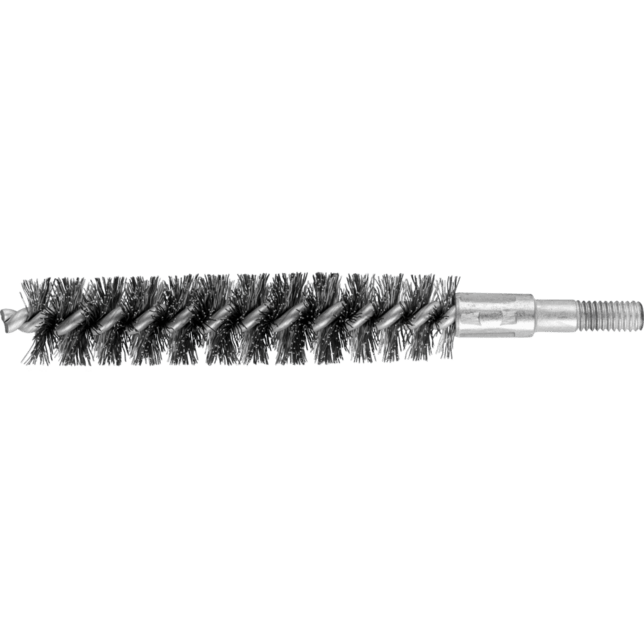 Obzvlášť vhodné na odhrotovanie a čistenie rúr, závitov, spojovacích manžiet a valcov. Oceľový drôt je najbežnejší materiál vlákna. Kefy s oceľovým drôtom ako materiálom vlákna sú obzvlášť vhodné na prácu na povrchoch a odhrotovanie. Špeciálny drôt PFERD TOOLS má vysokú pevnosť v ťahu a únosnosť pri ohybe. To zabezpečuje optimálne opotrebovanie drôtu, ako aj dlhú životnosť náradia, aj pri extrémnych aplikáciách čistenia. Oceľový drôt odoláva teplotám až do 300 °C. Okrem závitu má táto rúrková kefa stopku s priemerom 6 mm.