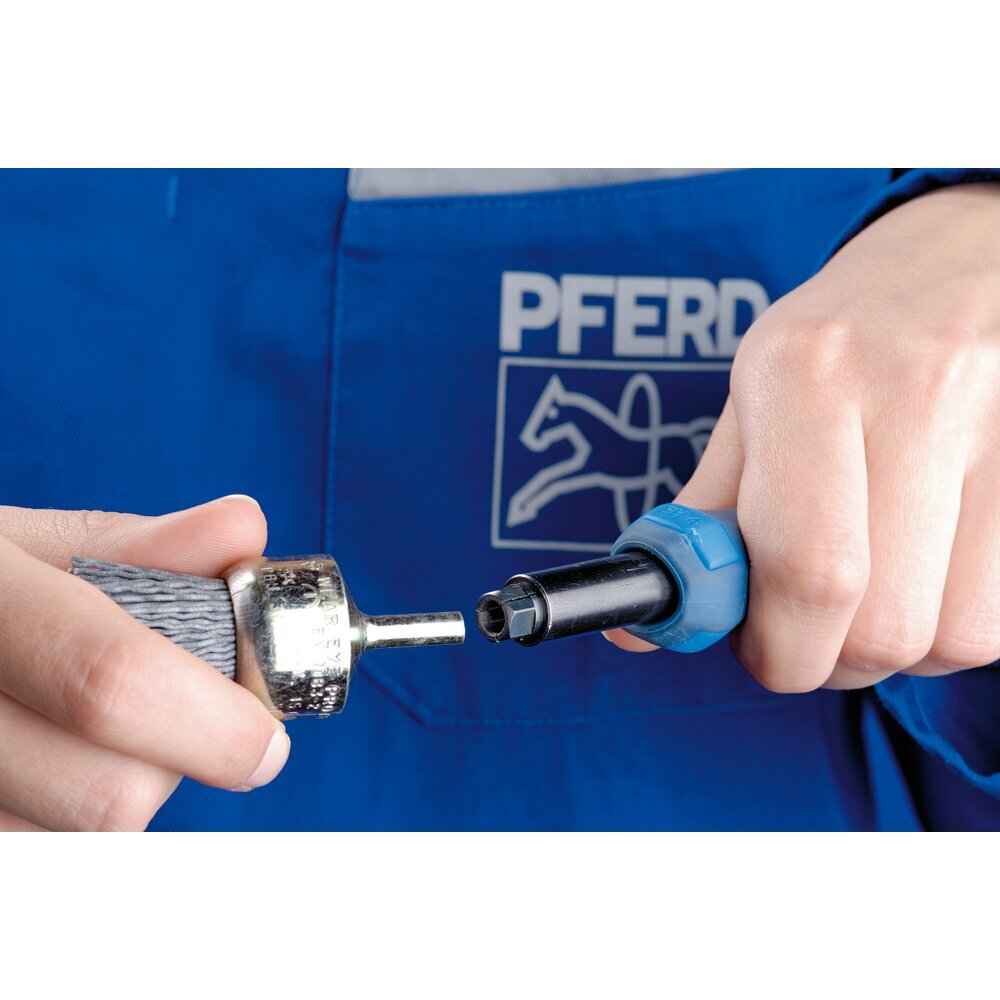 Vhodné na manuálnu prácu s trubkovými kefami. Rýchloupínacia rukoväť môže byť použitá so všetkými kolíkmi skupiny 10 na upnutie iných priemerov stopky.