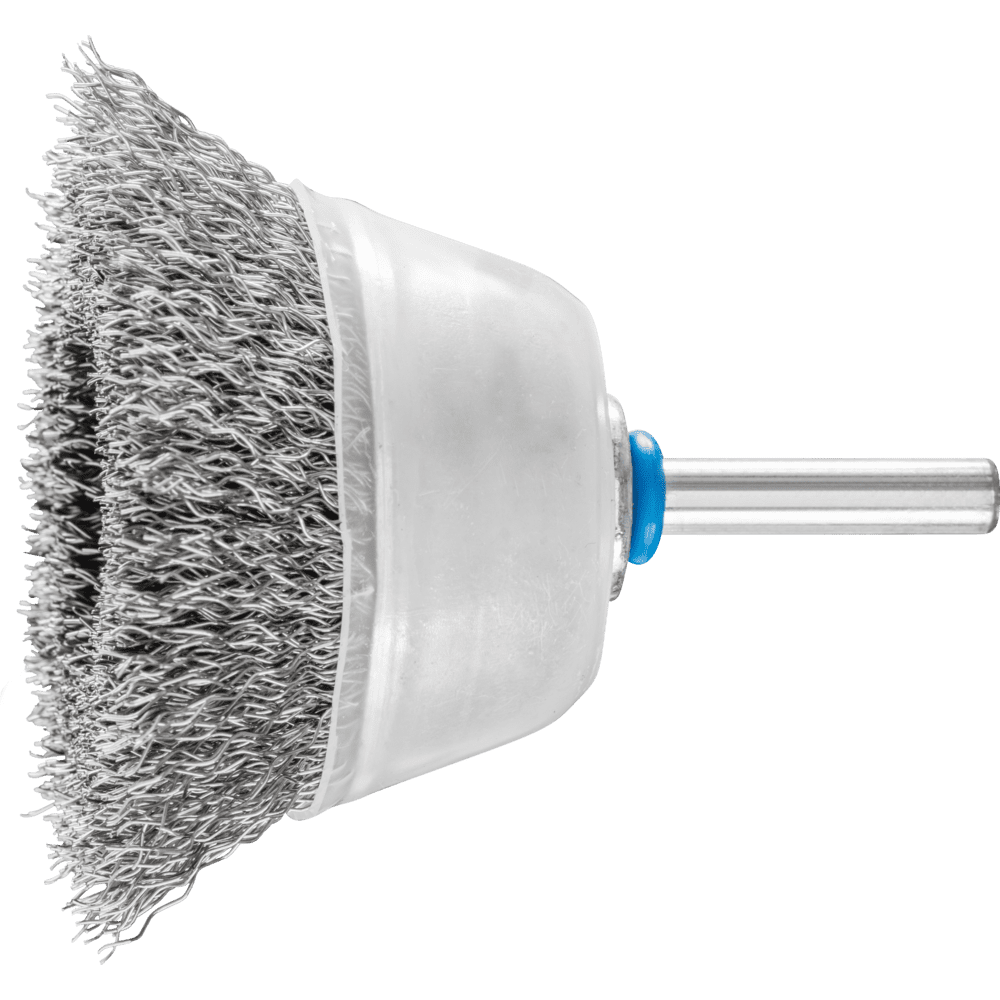 Všeobecne vhodné na čistenie, odhrdzovanie a vyhladzovanie, ako aj na odstraňovanie korózie a farby. Obzvlášť vhodné na čistenie veľkých, plochých a ľahko prístupných povrchov vďaka použitiu štetca celou plochou na obrobku. Aby sa splnili osobitné požiadavky na prácu s nehrdzavejúcou oceľou (INOX), PFERD TOOLS používa drôtovú kvalitu 1.4310 (V2A) pre všetky INOX štetce. Praktické skúsenosti z priemyslu ukázali, že to ponúka veľmi dobrú odolnosť voči korózii s optimálnou životnosťou nástroja. Všetky PFERD TOOLS štetce s INOX vláknami sú farebne označené modrou farbou a sú vhodné na použitie na všetkých nehrdzavejúcich oceľach (INOX), ako je V4A. Drôtová kvalita 1.4310 má tendenciu stať sa ferromagnetickou pri studenom spracovaní; t.j. môže byť priťahovaná magnetmi. Dôvodom je zmena mikroštruktúry spôsobená deformáciou (napr. počas procesu ťahania drôtu). To nemá žiadny vplyv na kvalitu a odolnosť voči korózii INOX vlákna. Vlákno je stále odolné voči korózii. Drôt z nehrdzavejúcej ocele (INOX) odoláva teplotám až do 450 °C. Kónický štetec s plastovým krytom.