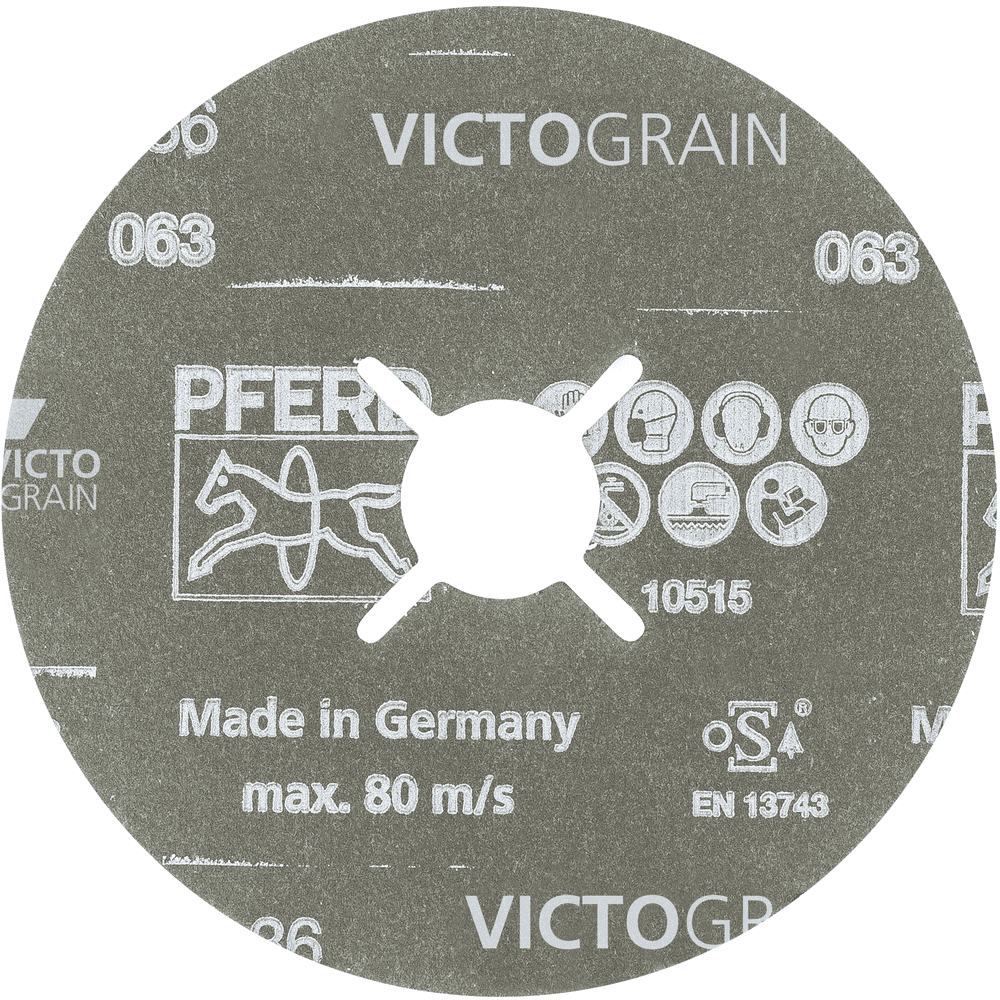 PFERD TOOLS vláknové disky sú vyrábané v súlade s ISO 16057 v tvare A1 verzia F pod označením "vulkanizovaný vláknový disk". Pre maximálne agresívne brúsenie s mimoriadne dlhou životnosťou nástroja a vynikajúcou rýchlosťou odstraňovania materiálu na oceľach a materiáloch, ktoré sú tvrdé alebo majú zlé tepelné vodivosti. Vynikajúci, konštantne vysoký výkon vďaka abrazívnemu zrna VICTOGRAIN. Aktívne brúsiace prísady v povlaku podstatne zlepšujú rýchlosť odstraňovania materiálu, zabraňujú upchávaniu a vedú k chladnejšiemu brúsenie. Produkty VICTOGRAIN sú jedny z najúčinnejších brúsiacich nástrojov na svete. Trojuholníkové, presne tvarované abrazívne zrno od PFERD TOOLS pomáha zabezpečiť jedinečne vysokú úroveň abrazívneho výkonu. Trojuholníky abrazívneho zrna VICTOGRAIN sú identické vo forme a veľkosti a ich rezné hrany sú aplikované na obrobok pod optimálnym uhlom, čo znamená, že zrno potrebuje veľmi málo energie na prenikanie do obrobku. Používateľ tak ťaží z efektívneho obrábacieho procesu s rýchlym pokrokom v práci, dlhou životnosťou nástroja, zníženým prítokom tepla do obrobku a nižším výkonom potrebným pre pohon nástroja. Trojuholníky abrazívneho zrna VICTOGRAIN sú pripevnené k substrátu na jednej strane. To znamená, že sú bezpečne upevnené a spolu so svojím štíhlym dizajnom ponúkajú mimoriadne veľký priestor na triesky, aby sa ďalej zlepšila efektivita obrábania. Štruktúra trojuholníkového VICTOGRAIN bola tiež špeciálne prispôsobená na maximalizáciu výsledkov. Veľmi malé kryštály vo vnútri trojuholníkov zabezpečujú optimálne opotrebovacie charakteristiky, pretože ostré rezné hrany sú vždy vystavené, ale iba minimálne množstvo abrazívneho zrna/trojuholník sa odlomí. Kombinovaním všetkých týchto vlastností majú používatelia prospech z konečného, konštantného výkonu počas chladného brúsenia a mimoriadne dlhého životnosti nástroja spolu s konzistentnou drsnosťou povrchu obrobku.