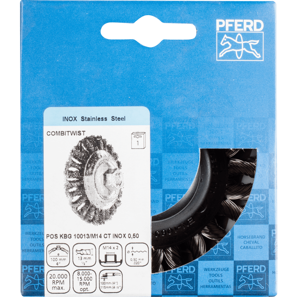 Veľmi agresívny štetec. Vynikajúci na ťažké brúsenie, ako je odhrotovanie, čistenie, odrezávanie hrdze a odstraňovanie usadenín. Aby sa splnili osobitné požiadavky pri práci s nehrdzavejúcou oceľou (INOX), PFERD TOOLS používa drôtovú kvalitu 1.4310 (V2A) pre všetky INOX štetce. Praktické skúsenosti z priemyslu ukázali, že to ponúka veľmi dobrú odolnosť voči korózii s optimálnou životnosťou nástroja. Všetky štetce PFERD TOOLS s INOX vláknami sú farebne označené modrou farbou a sú vhodné na použitie na všetkých nehrdzavejúcich oceľach (INOX), ako je V4A. Drôtová kvalita 1.4310 má tendenciu stať sa feromagnetickou pri studenom spracovaní; t.j. môže byť priťahovaná magnetmi. Dôvodom je zmena mikroštruktúry spôsobená deformáciou (napr. počas procesu ťahania drôtu). To nemá žiadny vplyv na kvalitu a odolnosť voči korózii INOX vlákna. Vlákno je stále odolné voči korózii. Drôt z nehrdzavejúcej ocele (INOX) odoláva teplotám až do 450 °C.