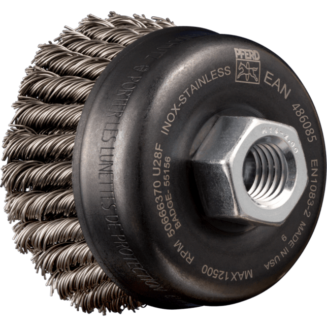 Dvojradová, veľmi agresívna a robustná kefa, ktorá je schopná odolávať vysokým mechanickým zaťaženiam. Vynikajúca na ťažké brúsenie, ako je odhrotovanie, čistenie, odrezávanie hrdze a odstraňovanie striekajúcej farby. Aby sa splnili osobitné požiadavky na prácu s nehrdzavejúcou oceľou (INOX), PFERD TOOLS používa drôtovú kvalitu 1.4310 (V2A) pre všetky INOX kefy. Praktické skúsenosti z priemyslu ukázali, že to ponúka veľmi dobrú odolnosť voči korózii s optimálnou životnosťou nástroja. Všetky kefy PFERD TOOLS s INOX vláknami sú farebne označené modrou farbou a sú vhodné na použitie na všetkých nehrdzavejúcich oceľach (INOX), ako je V4A. Drôtová kvalita 1.4310 má tendenciu stať sa feromagnetickou pri studenom spracovaní; t.j. môže byť priťahovaná magnetmi. Dôvodom je zmena mikroštruktúry spôsobená deformáciou (napr. počas procesu ťahania drôtu). To nemá žiadny vplyv na kvalitu a odolnosť voči korózii INOX vlákna. Vlákno je stále odolné voči korózii. Drôt z nehrdzavejúcej ocele (INOX) odoláva teplotám až do 450 °C.