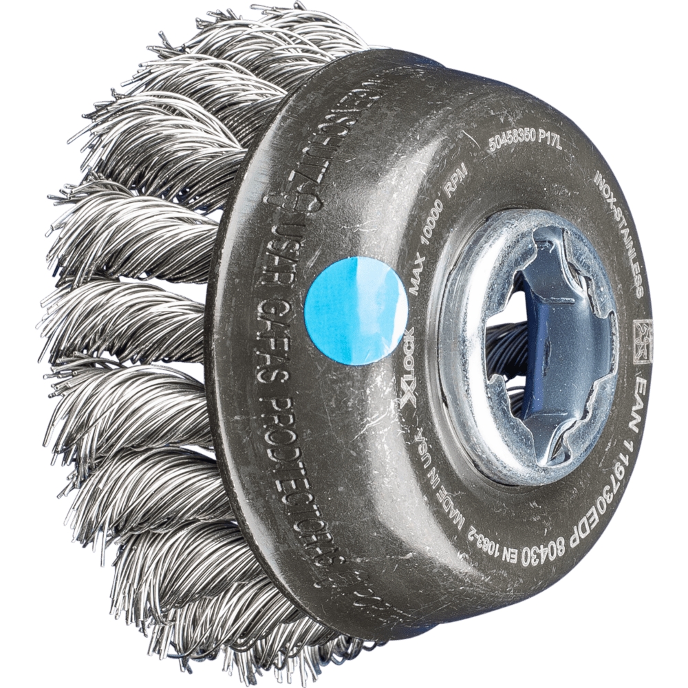 Aggresívny štetec. Vynikajúci na ťažké brúsenie, ako je odhrotovanie, čistenie, odrezávanie hrdze a odstraňovanie splaškov. Systém Bosch X-LOCK pre uhlové brúsky umožňuje rýchlu a jednoduchú výmenu náradia. Namiesto okrúhleho stredového otvoru má systém X-LOCK tvar X, ktorý umožňuje náradiu byť upevnenému na uhlovej brúske v presne tvarovanej forme. To znamená, že rôzne druhy náradia môžu byť spoľahlivo upnuté v veľmi krátkom čase. Tento jedinečný systém spĺňa najvyššie štandardy kvality a bezpečnosti a dokáže odolať drsným a náročným podmienkam aplikácie. X-LOCK od Bosch je prvý systém rýchlej výmeny na svete pre uhlové brúsky: Umiestnite náradie do držiaka X-LOCK, kliknite na miesto – a ste pripravení! Nikdy nebolo jednoduchšie meniť príslušenstvo na uhlových brúskach. X-LOCK vytvára nový štandard, ktorý uľahčuje život profesionálom a zvyšuje ich produktivitu. Bosch Power Tools sa spolieha na silných partnerov, ako sú PFERD TOOLS. PFERD TOOLS vyvinul princíp pre spojenie X-LOCK vyrazeného dielu s lepeným abrazívom, lamelovými kotúčmi a štetcami a vytvoril podmienky na ich priemyselnú výrobu. Aby splnil osobitné požiadavky na prácu s nehrdzavejúcou oceľou (INOX), PFERD TOOLS používa drôtovú kvalitu 1.4310 (V2A) pre všetky INOX štetce. Praktické skúsenosti z priemyslu ukázali, že to ponúka veľmi dobrú odolnosť voči korózii s optimálnou životnosťou náradia. Všetky štetce PFERD TOOLS s INOX vláknami sú farebne kódované modrou farbou a sú vhodné na použitie na všetkých nehrdzavejúcich oceľach (INOX), ako je V4A. Drôtová kvalita 1.4310 má tendenciu stať sa feromagnetickou pri studenom spracovaní; t.j. môže byť priťahovaná magnetmi. Nehrdzavejúci oceľový drôt (INOX) odoláva teplotám až do 450 °C.