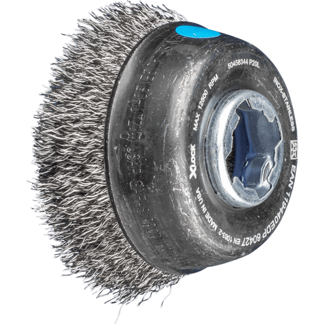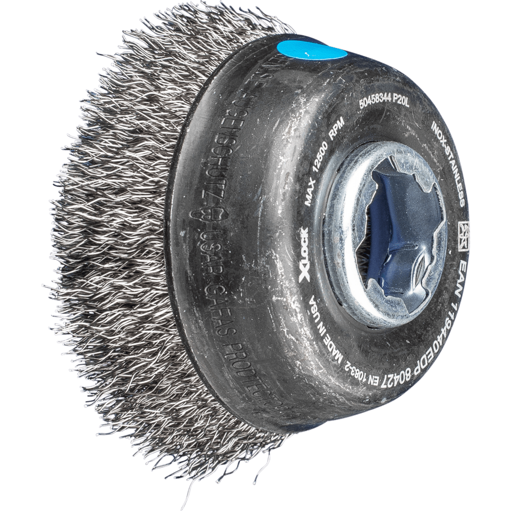 Vynikajúce na stredne náročné čistenie, ako je odhrotovanie, čistenie a odrezávanie hrdze na veľkých plochách. Systém Bosch X-LOCK pre uhlové brúsky umožňuje rýchlu a jednoduchú výmenu náradia. Namiesto okrúhleho stredového otvoru má systém X-LOCK X-tvarovaný kontúr, ktorý umožňuje náradiu byť upevnenému na uhlovej brúske v presne tvarovanej forme. To znamená, že rôzne druhy náradia môžu byť spoľahlivo upnuté za veľmi krátky čas. Tento jedinečný systém spĺňa najvyššie štandardy kvality a bezpečnosti a dokáže odolať drsným a náročným podmienkam aplikácie. X-LOCK od Bosch je prvý systém rýchlej výmeny náradia pre uhlové brúsky na svete: Umiestnite náradie do držiaka X-LOCK, kliknite na miesto – a ste pripravení! Nikdy nebolo tak jednoduché meniť príslušenstvo na uhlových brúskach. X-LOCK vytvára nový štandard, ktorý uľahčuje život profesionálom a zvyšuje ich produktivitu. Bosch Power Tools sa spolieha na silných partnerov ako PFERD TOOLS. PFERD TOOLS vyvinul princíp pre spojenie X-LOCK vyrazeného dielu s lepeným abrazívom, lamelovými kotúčmi a kefami a vytvoril podmienky na ich priemyselnú výrobu. Aby splnil osobitné požiadavky na prácu s nehrdzavejúcou oceľou (INOX), PFERD TOOLS používa drôtovú kvalitu 1.4310 (V2A) pre všetky INOX kefy. Praktické skúsenosti z priemyslu ukázali, že to ponúka veľmi dobrú odolnosť voči korózii s optimálnou životnosťou náradia. Všetky kefy PFERD TOOLS s INOX vláknami sú farebne kódované na modro a sú vhodné na použitie na všetkých nehrdzavejúcich oceľach (INOX), ako je V4A. Drôtová kvalita 1.4310 má tendenciu stať sa feromagnetickou pri studenom spracovaní; t.j. môže byť priťahovaná magnetmi. Nehrdzavejúci oceľový drôt (INOX) odoláva teplotám až do 450 °C.