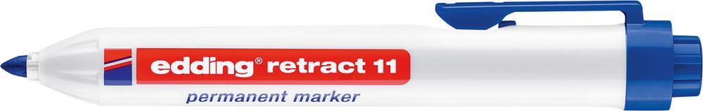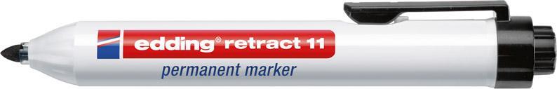 Permanentný popisovač edding retract 11 Vyhotovenie: Guľatý hrot s plastovým plášťom. Tlaková mechanika pre ovládanie jednou rukou. Krytka nie je potrebná, špeciálna technika uzatvárania zabraňuje vyschnutiu popisovača po zasunutí hrotu. Rýchloschnúci, permanentný atrament bez zápachu, neobsahuje tuluol/xylen, odolný proti oderu a vodoodolný, svetlostály a doplniteľný. Použitie: Na popisovanie takmer všetkých materiálov, dokonca aj kovu, skla a plastu. Výrobca: edding Aktiengesellschaft, An der Feldmark 9B, 31515 Wunstorf, DE, +4950311500, info@edding.com