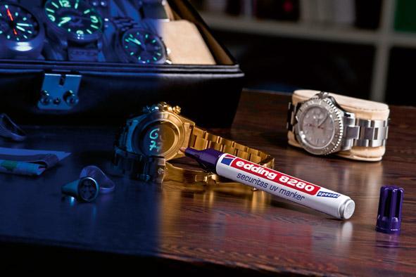 UV značkovač edding 8280 Provedenie: Kulatý hrot s hliníkovou stopkou (100% recyklovaný hliník). Rýchloschnúci, permanentný špeciálny atrament, ktorý je viditeľný iba pri UV svetle, odolný proti oderu a vodeodolný. Použitie: Obzvlášť vhodný pre skryté značenie a popisovanie takmer všetkých materiálov, vrátane kovov, skla a plastov. Výrobca: edding Aktiengesellschaft, An der Feldmark 9B, 31515 Wunstorf, DE, +4950311500, info@edding.com