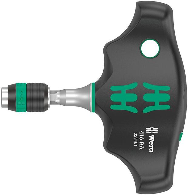 Držiak na bity s priečnou rukoväťou s funkciou ráčny a rýchlovýmenné sklíčidlo 416 RA Vyhotovenie: ručný držiak bitov s priečnou rukoväťou a Rapidaptor rýchlovýmenným sklíčidlom. Ráčna s jemným ozubením (80 zubov, uhol spätného otáčania 4,5°) integrovaná v dvousložkovej rukoväti a prepínacia páka sa postarajú o bezpečnú a rýchlu prácu. Vďaka guľôčkovej aretácii hlavice nástrčných kľúčov bezpečne drží. Výrobca: Wera Werkzeuge GmbH, Korzerter Str. 21-25, 42349 Wuppertal, DE, +4920240450, sales@wera.de