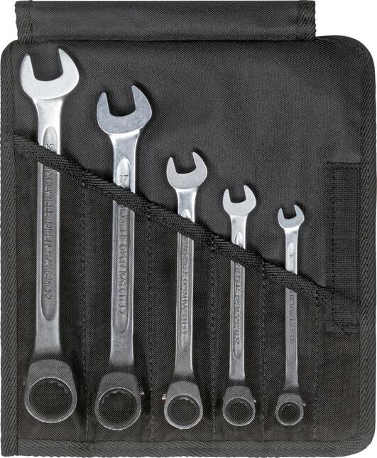 Sada vidlicových kľúčov s očkovou ráčnou, prepínateľných, Hazet Provedenie: Z ocele legovanej chrómom, pochromované. So 72 zubami a nastavovacím uhlom 5°. Presný ozubený ráčnový mechanizmus. Uhol zalomenia čeľuste 15°. Točivé momenty prekračujú hodnoty stanovené podľa DIN 3113. Dodáva sa v rolovacej taške. Výrobca: STAHLWILLE Eduard Wille GmbH & Co. KG, Lindenallee 27, 42349 Wuppertal, DE, +4920247910, info@stahlwille.de