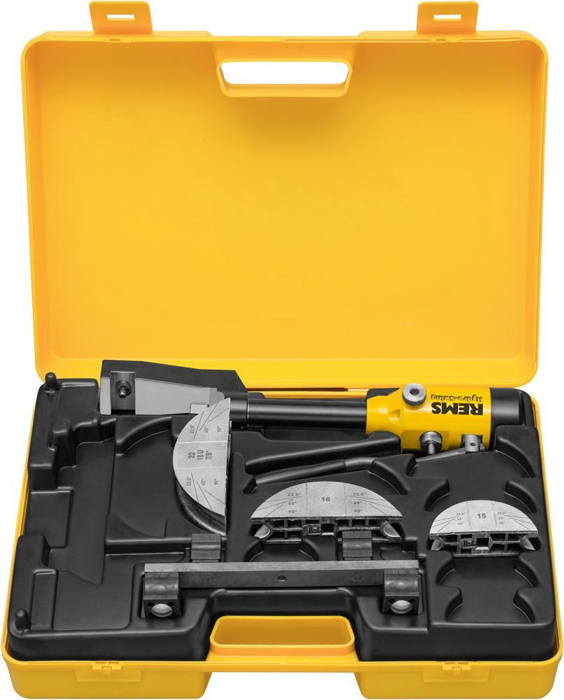 Jednoručná ohýbačka rúrok, s hydraulickým posuvom Provedenie: Robustná ohýbačka s uzavretým bezúdržbovým hydraulickým systémom, ovládanie jednou rukou. Objem dodávky: Pohon ohýbačky, ohýbacie segmenty, 1 nosič smýkadla s klzákmi a krabice z oceľového plechu. Ohýbacie segmenty z hliníka. Pre jednoduché, rýchle a rozmerovo presné ohýbanie do 90° napr. nerezových oceľových rúrok, oceľových rúrok obsahujúcich nikl lisovaných fitinkových systémov EN 10217-7, EN 10312, séria 2, materiál 1.4401. Výrobca: REMS GmbH & Co KG, Stuttgarter Str.83, 71332 Waiblingen, DE, +49715117070, info@rems.de