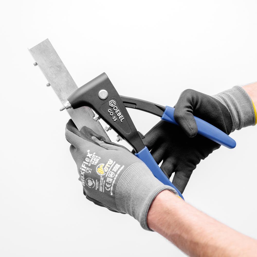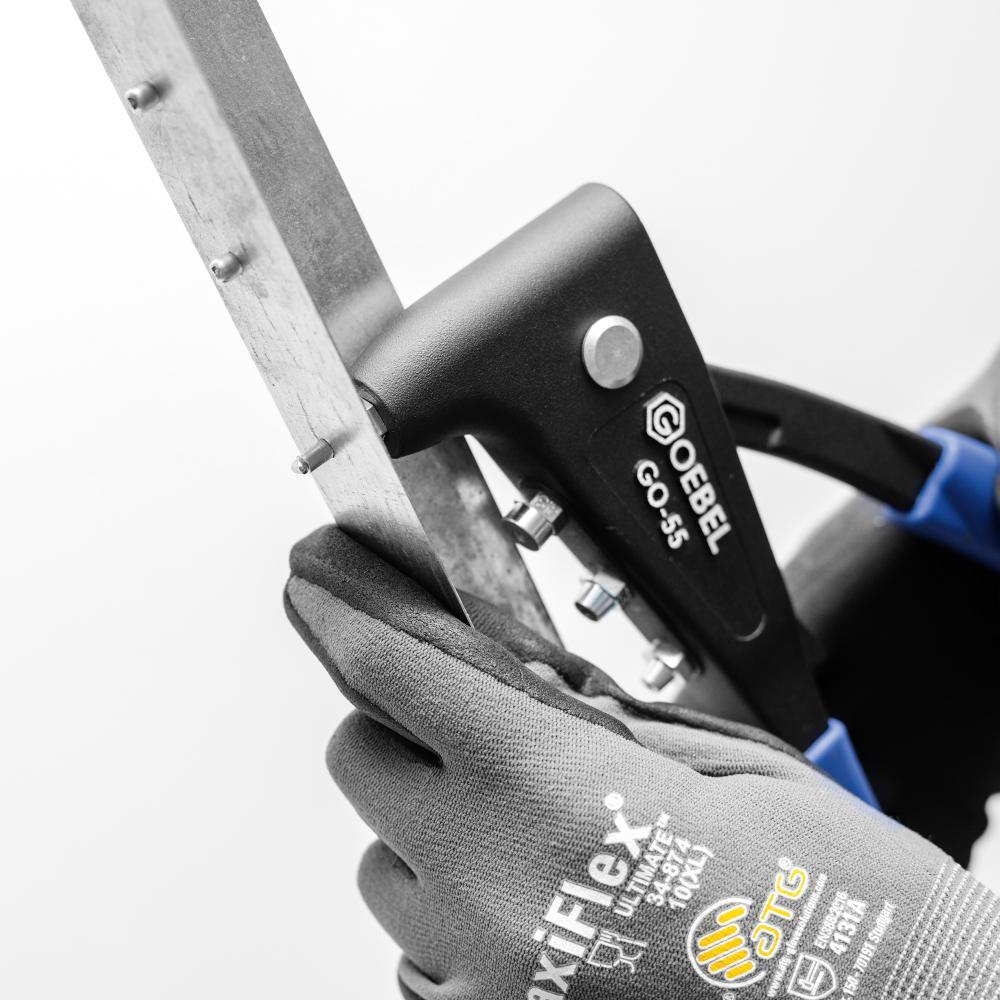 Ručné nýtovacie kliešte GO-55 Vyhotovenie: Z kvalitného hliníkového tlakového odlitku s kovanými ramenami klieští z ocele. Ručné kliešte sú navyše vybavené ergonomicky tvarovanými manžetovými rukoväťami pre optimálne ovládanie jednou rukou a tiež prídržnou svorkou. Použitie: Pre trhacie nýty Ø 2,4 až 4,8 mm z hliníka a ocele a do Ø 4 mm u všetkých materiálov. Obsah dodávky: ručné nýtovacie kliešte GO-55, 4 špičky Ø 2,4; 3–3,2; 4; 4,8 mm, montážny kľúč. Priradenie špičiek: Ø nýtu: 2,4; materiál nýtu: hliník, oceľ, nerez Ø nýtu: 3–3,2; materiál nýtu: hliník, oceľ, nerez Ø nýtu: 4; materiál nýtu: hliník, oceľ, nerez Ø nýtu: 4,8; materiál nýtu: hliník, oceľ Výrobca: Goebel GmbH, Mühlenstr., 40699 Erkrath, DE, +492112450000, info@goebel-group.com