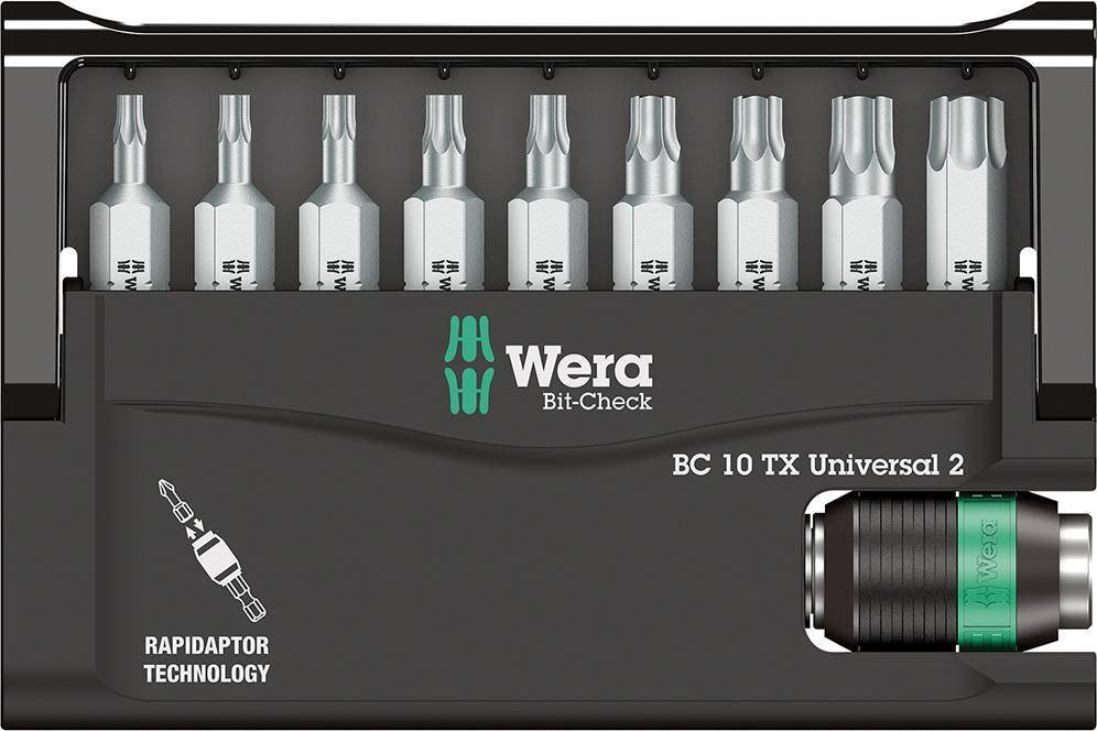 Sortiment bitov 10 TX Universal 2, vnútorné TORX®, 10-dielny. Vyhotovenie: S húževnatými bitmi v plastovom držiaku. Bity sú prehľadne usporiadané a dajú sa rýchlo a cielene vybrať. Použitie: Pre univerzálne použitie. Výrobca: Wera Werkzeuge GmbH, Korzerter Str. 21-25, 42349 Wuppertal, DE, +4920240450, sales@wera.de
