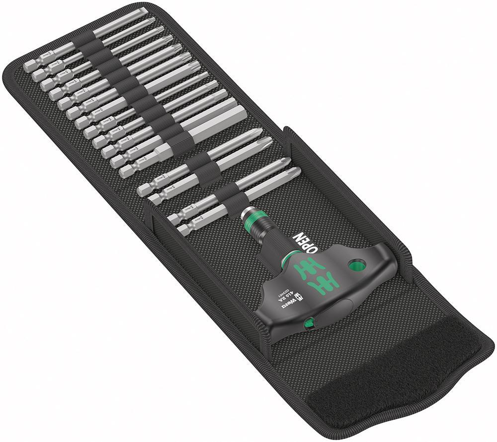 Sortiment bitov Kraftform Kompakt 400 RA Prevedenie: S bitmi, tvrdý typ. Držák bitov s priečnou rukoväťou s funkciou ráčny a rýchlovýmenné sklíčidlo Rapidaptor. Ráčna s jemným ozubením (80 zubov, spätný uhol 4,5°) integrovaná v dvousložkovej rukoväti sa postará o bezpečnú a rýchlu prácu. Držák bitov Rapidaptor s rýchlo-otočným puzdrom umožňuje rýchlu výmenu bitov. Bity a rukoväť sú prehľadne usporiadané v skladacej taške. Výrobca: Wera Werkzeuge GmbH, Korzerter Str. 21-25, 42349 Wuppertal, DE, +4920240450, sales@wera.de