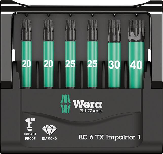 Sortiment bitov Mini-Check Impaktor, vnútorný TORX® Provedenie: S bitmi Impaktor v plastovom držiaku. Bity sú prehľadne usporiadané a dajú sa rýchlo a cielene vybrať. Nanesením diamantovej vrstvy sa zredukujú „cam-out sily“, ktoré vyžadujú vysoký pritlačný tlak počas skrutkovania. Vďaka technológii Impaktor dlhšia životnosť v porovnaní so štandardnými alebo torznými bitmi. Použitie: Obzvlášť vhodné na použitie s bežnými impaktnými/nárazovými skrutkovačmi. Výrobca: Wera Werkzeuge GmbH, Korzerter Str. 21-25, 42349 Wuppertal, DE, +4920240450, sales@wera.de